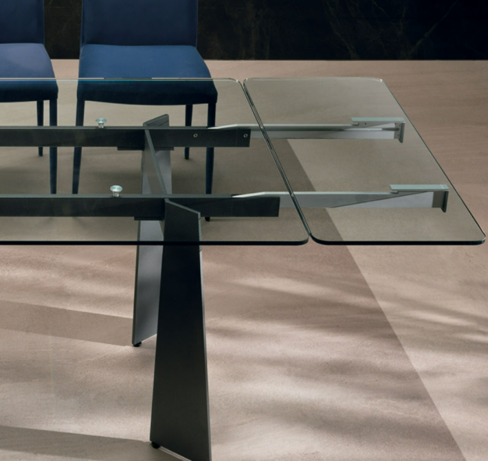 Il tavolo Atlante è interamente in legno, disponibile nelle finiture noce canaletto e rovere coke termo-trattato. Le gambe a cavalletto della larghezza di 17 cm gli conferiscono un aspetto maestoso. La bisellatura del piano mette in risalto le calde venature del legno. Il tavolo è dotato di un sistema di allunghe con guide in alluminio anodizzato. Le allunghe, da 40 cm, sono interne in biglia con il
