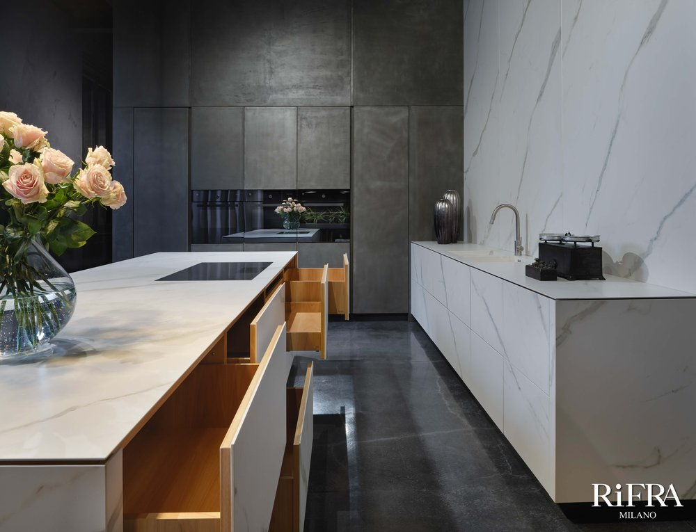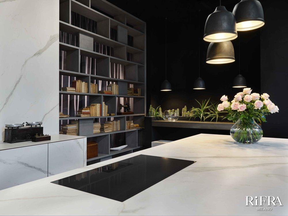 Finitura mobili isola e quinte: cemento nero spatolato a mano.