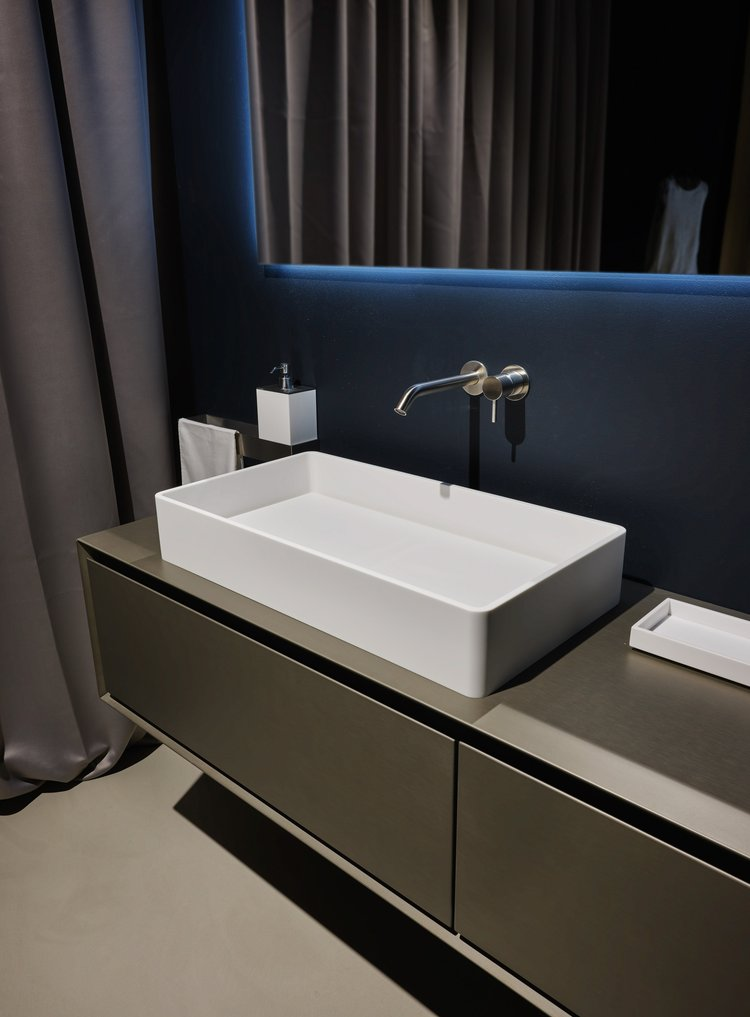 Finitura mobili isola e quinte: cemento nero spatolato a mano.