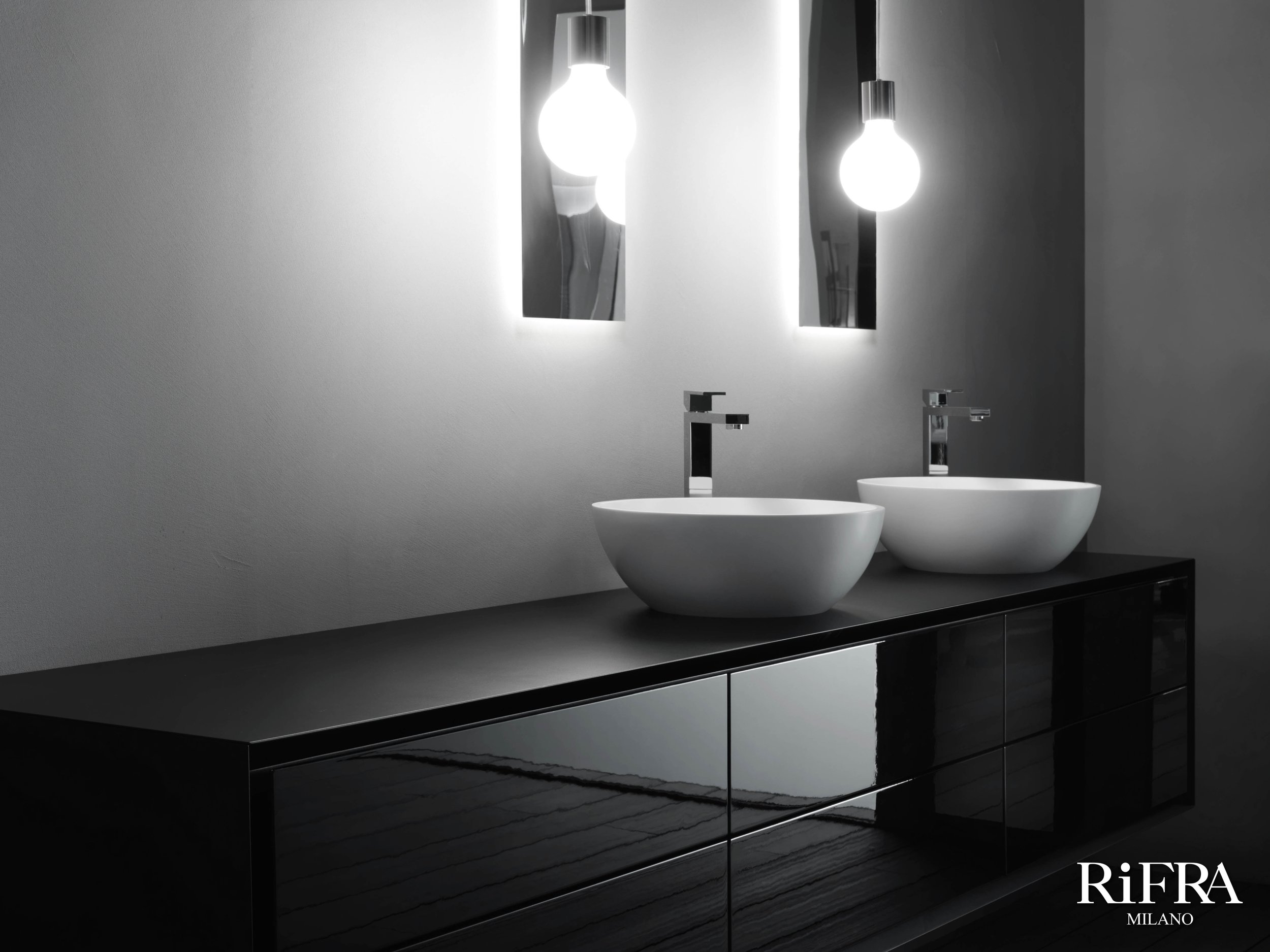 Finitura mobili isola e quinte: cemento nero spatolato a mano.