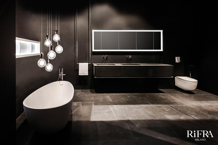 Finitura mobili isola e quinte: cemento nero spatolato a mano.