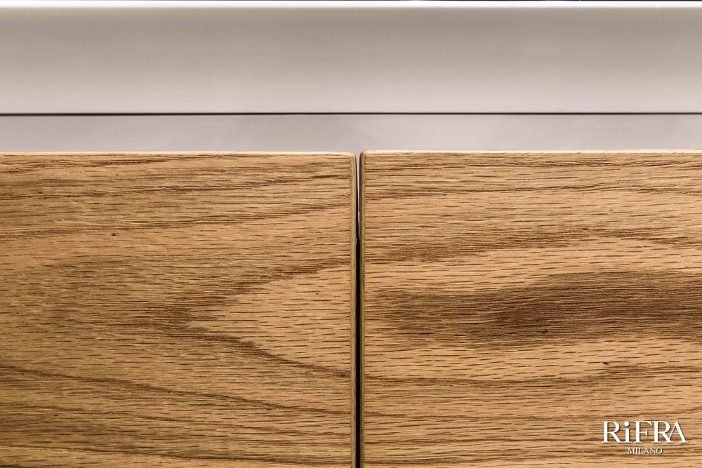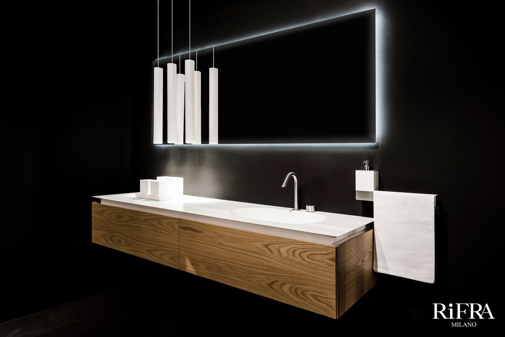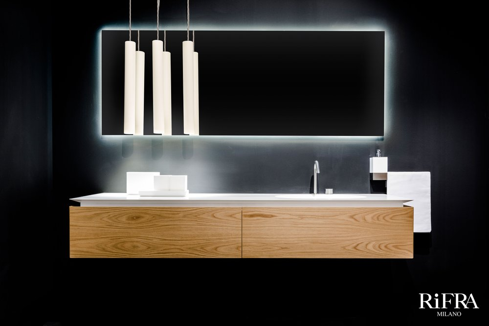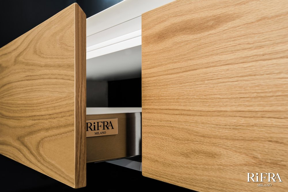 Finitura mobili isola e quinte: cemento nero spatolato a mano.