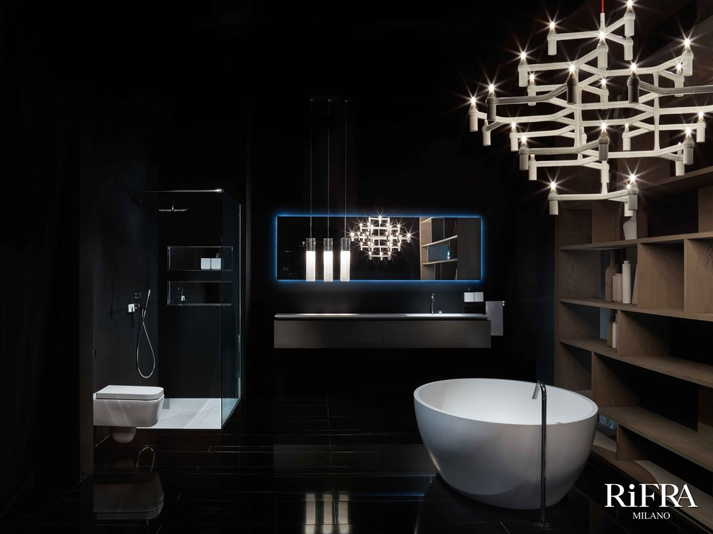 Finitura mobili isola e quinte: cemento nero spatolato a mano.
