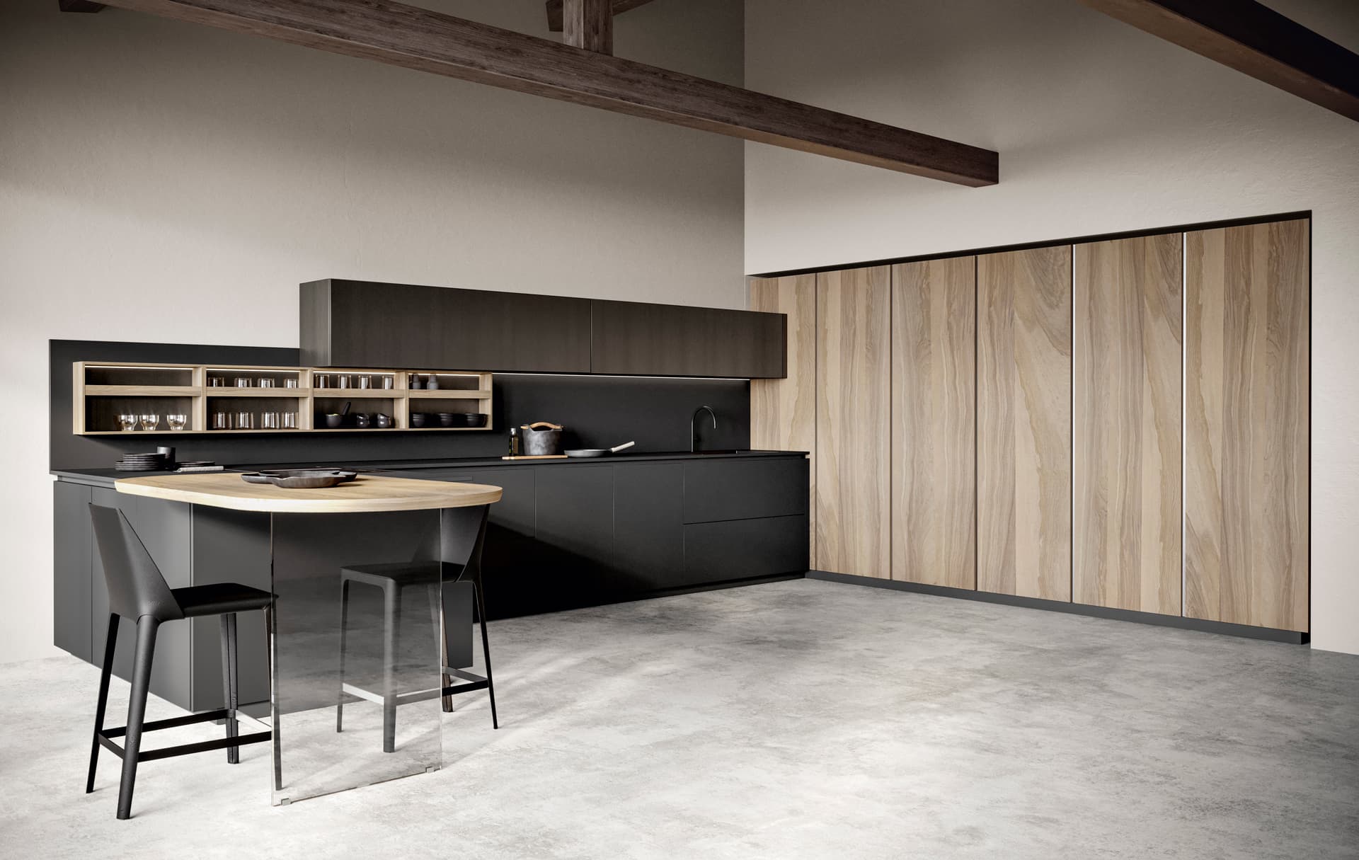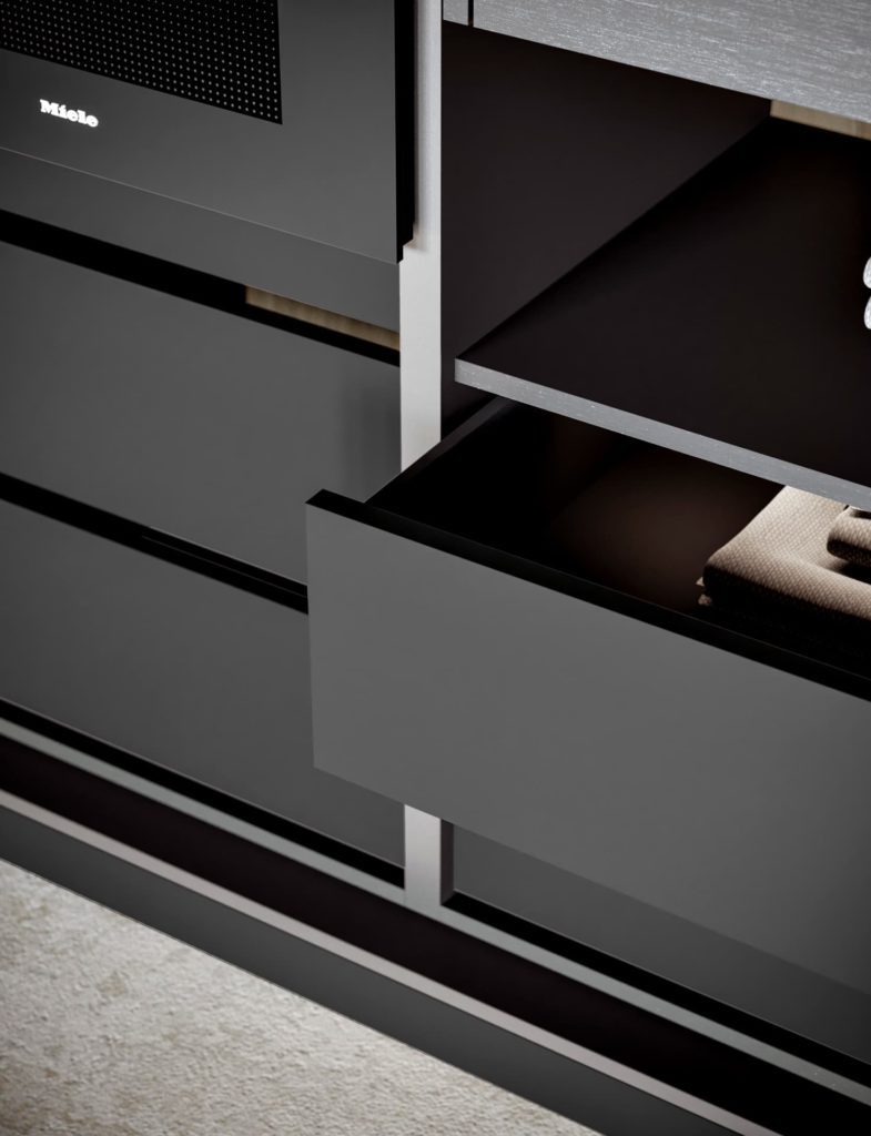 Massimo Castagna ripensa ed evolve la tipologia base della cucina contemporanea realizzando un progetto originale e innovativo che va oltre il concetto della cucina caratterizzata dall’anta: basi con volumetria a zoccolo basso a grande capienza e una vasta quantità di componenti speciali che, come oggetti, sono aggregabili alla composizione delle basi, proponendo nuovi significati e funzionalità, oltre che un alto grado di personalizzazione. Un progetto dinamico, costantemente in progress che evolve e si arricchisce man mano di nuovi elementi, valori, materie e significati.