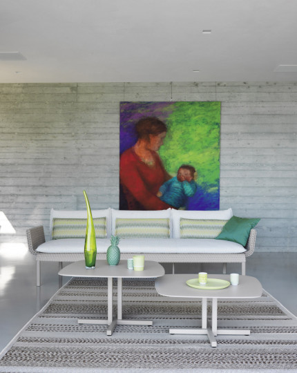 Divano in acciaio 304 verniciato a polveri, intrecciato con Flat Trendyrope. Un divano accogliente, dove la particolare geometria dello schienale si coniuga perfettamente al desiderio di comfort, creando un angolo per vivere momenti di relax. Ottimo per arredare terrazzi e patio, dona forte personalità anche alle zone living interne. Ideale per arredamenti residenziali e contract.