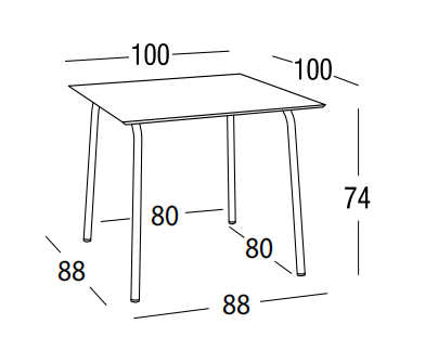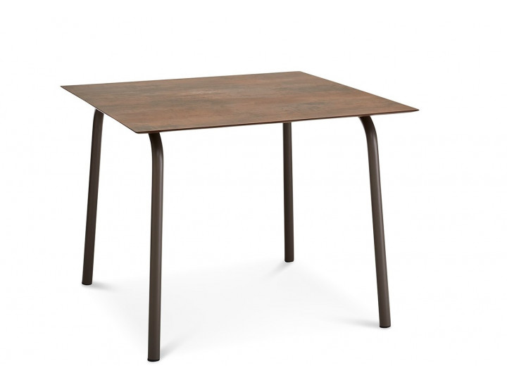 Tavolo quadrato con base in acciaio verniciato a polveri, top in HPL per esterni, finitura in corten. La finitura in corten dà un tocco di vissuto a questo tavolo dalle linee semplici e dai colori mediterranei. La qualità dei materiali lo rende ideale sia per l‘arredamento esterno che interno, adatto ad un arredamento residenziale e contract.
