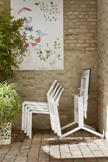 Base tavolo con colonna e crociera sotto-piano in alluminio. Verniciatura a polveri (RAL 9006). La colonna poggia su una base tonda, ideale per l’arredamento esterno di bar e ristoranti sia in situazioni contract che residenziali.