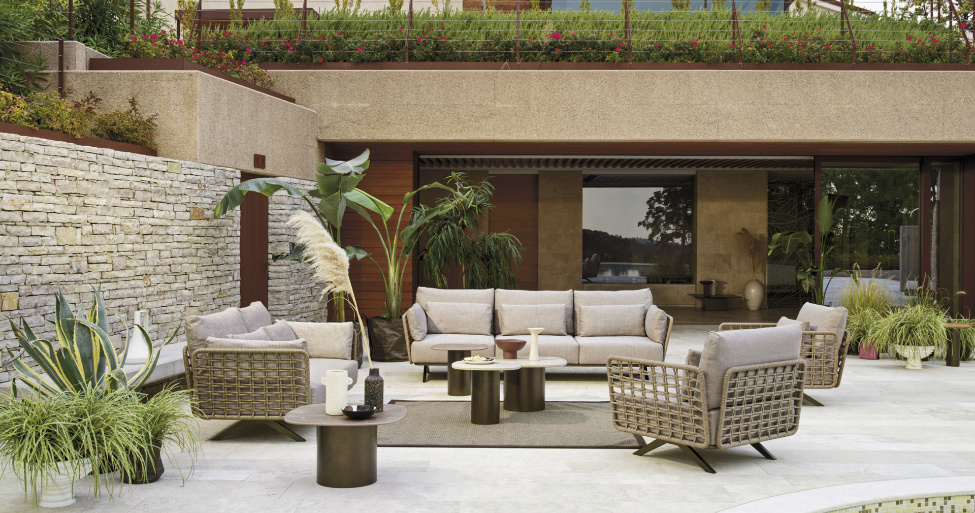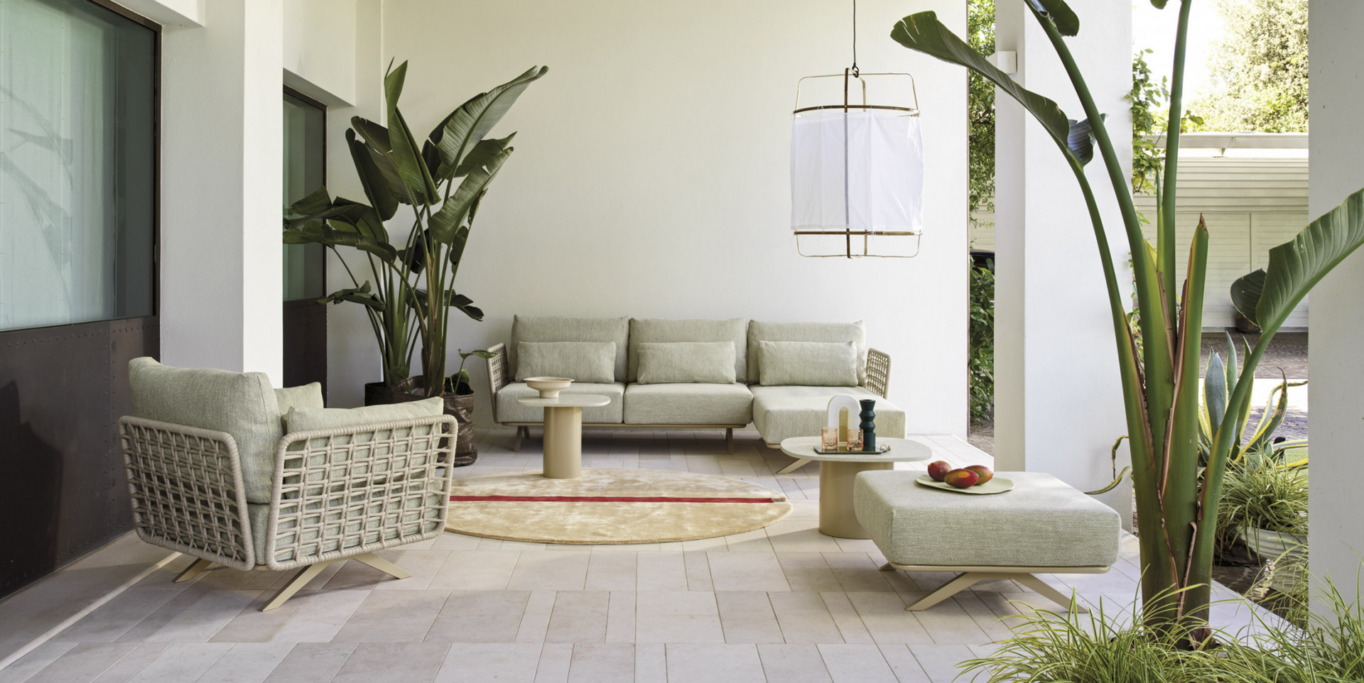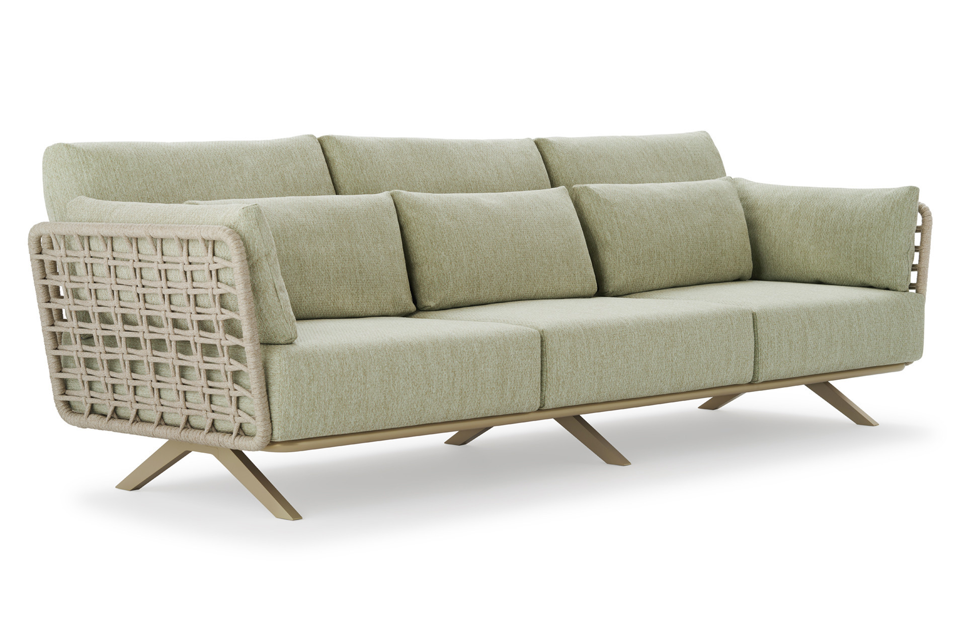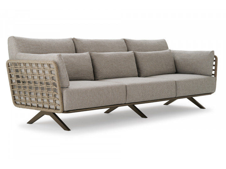 Divano 3 posti in acciaio inox Aisi 304 ed alluminio, verniciato a polveri ed intrecciato in Oval Trendyrope. Linee che valorizzano l'iconico stile italiano, dove le lavorazioni in corda donano un'estetica materica ed artigianale alla morbidezza avvolgente delle sedute, per concepire uno spazio ideale, dedicato al relax e alla socializzazione. Progettato sia per l'arredamento residenziale che contract, outdoor e indoor.