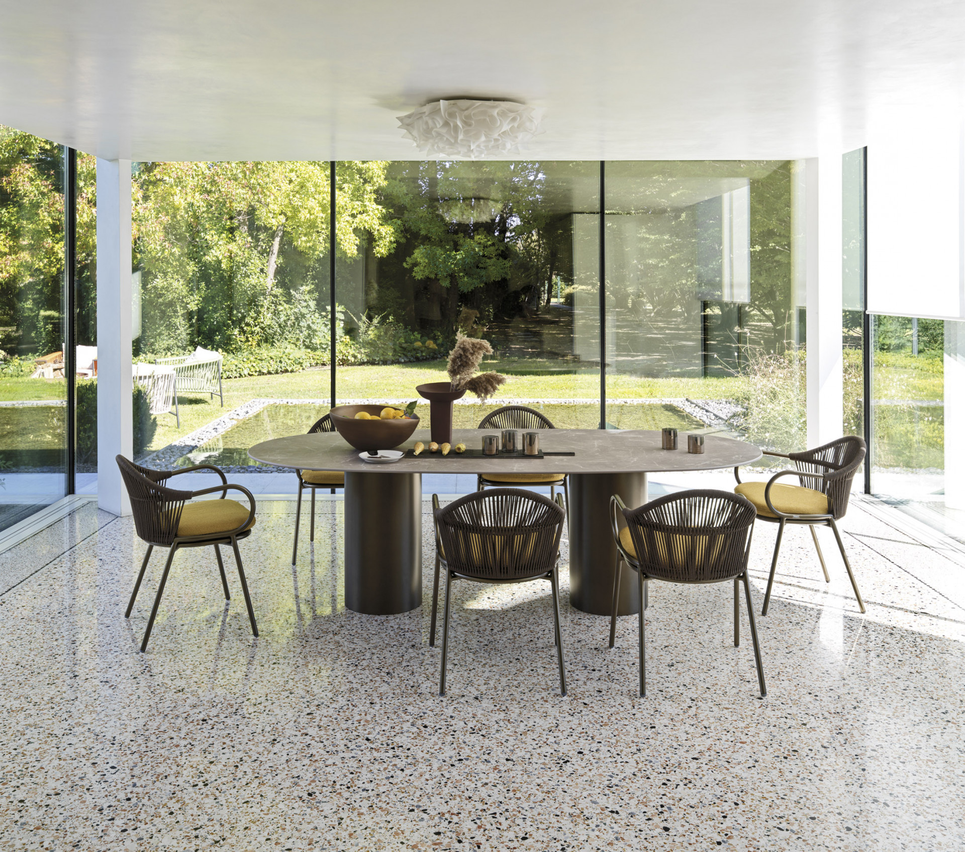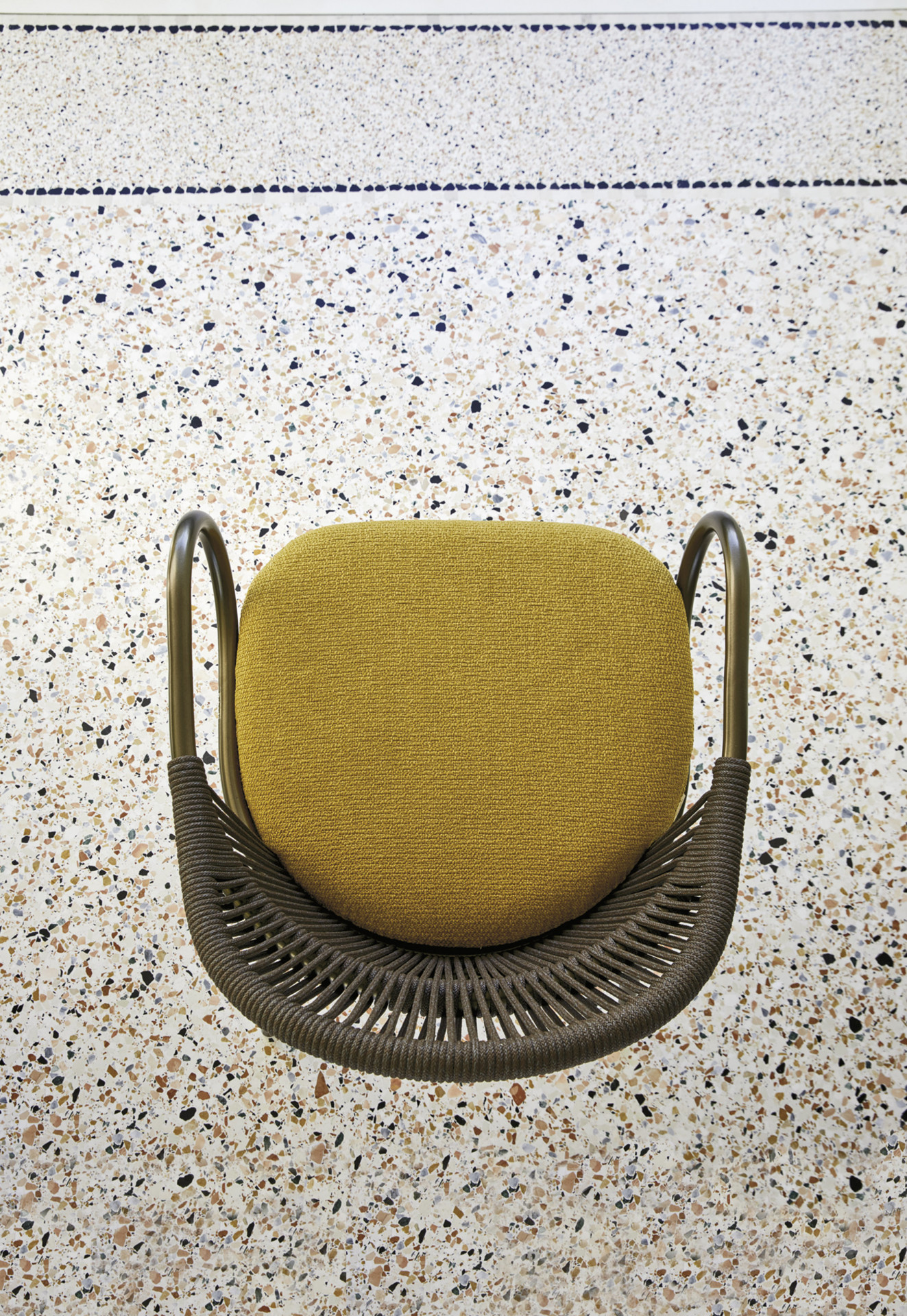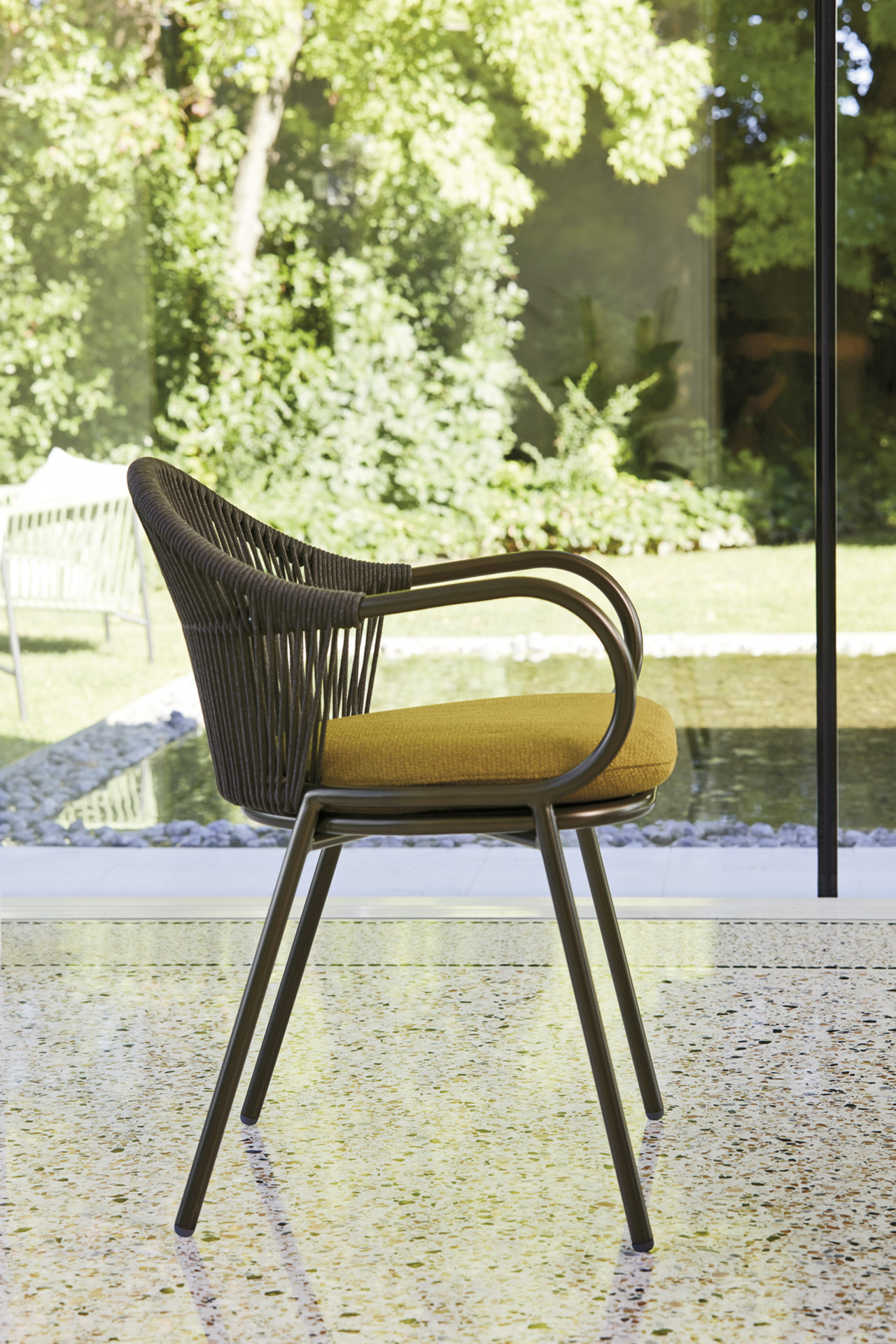 Sedia in alluminio verniciato a polveri, intrecciata con Round Trendyrope. Un design che trae ispirazione dalle forme sinuose della natura, in un alternarsi di curve armoniose, geometrie e texture per creare un'estetica delicata ed al contempo incisiva. Ideale sia in contesti residenziali che contract, sia per outdoor che indoor.