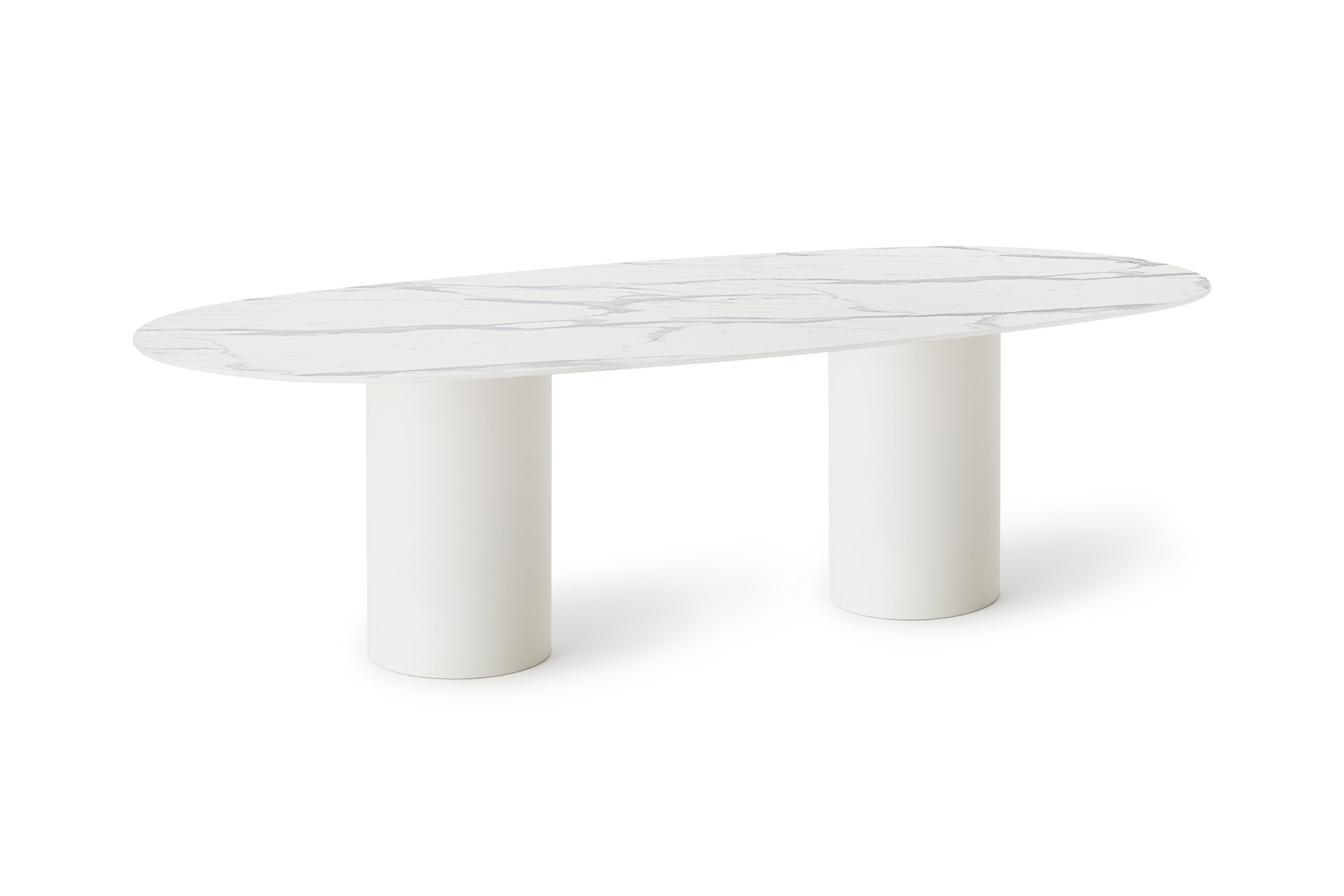 Tavolo ovale con base in lamiera di acciaio 304 verniciato a polveri, top in HPL. Dal design minimalista e moderno, questo tavolo dalle dimensioni generose, si caratterizza per il doppio basamento cilindrico che lo rende protagonista del vostro living, grazie alla forte espressione dei suoi materiali.