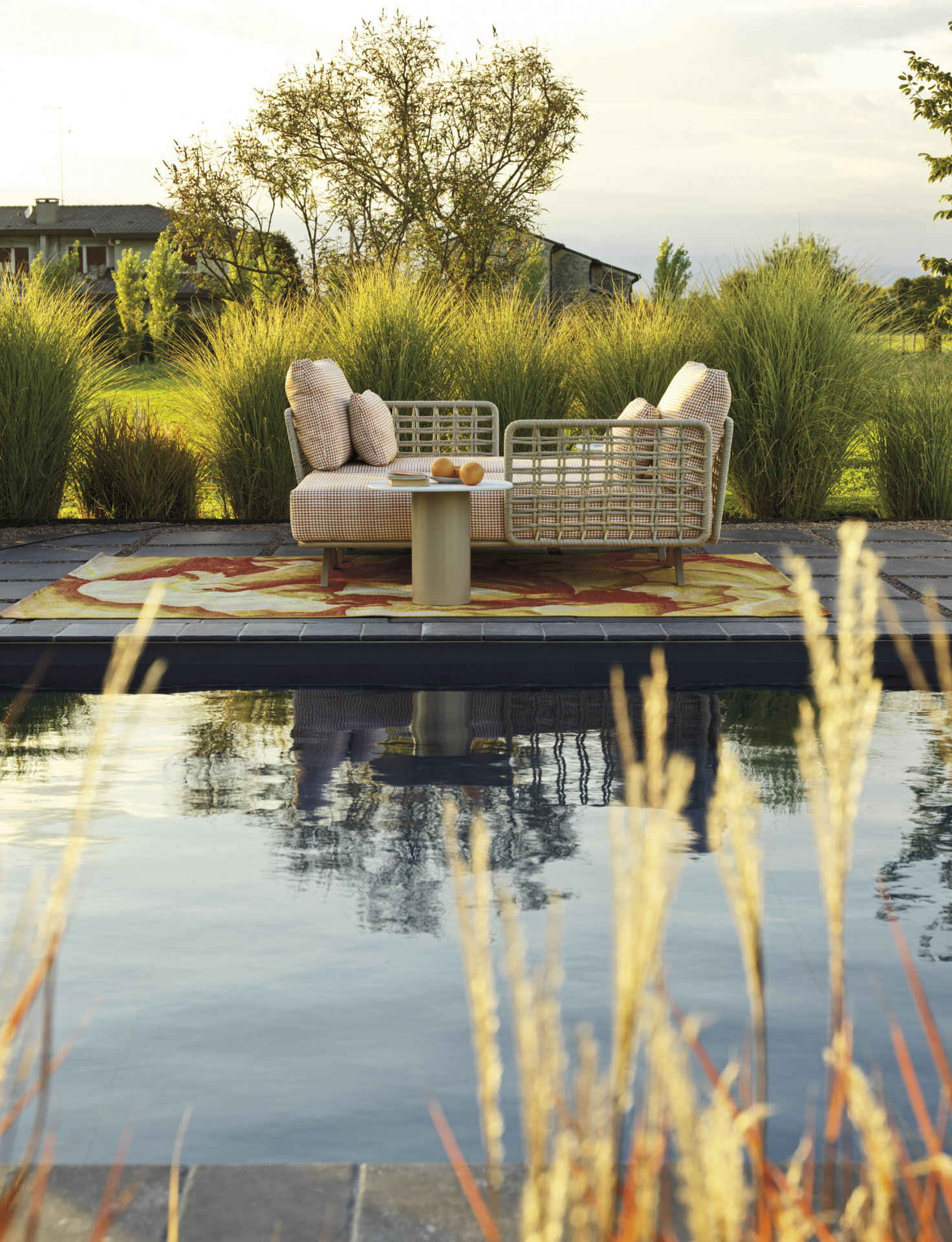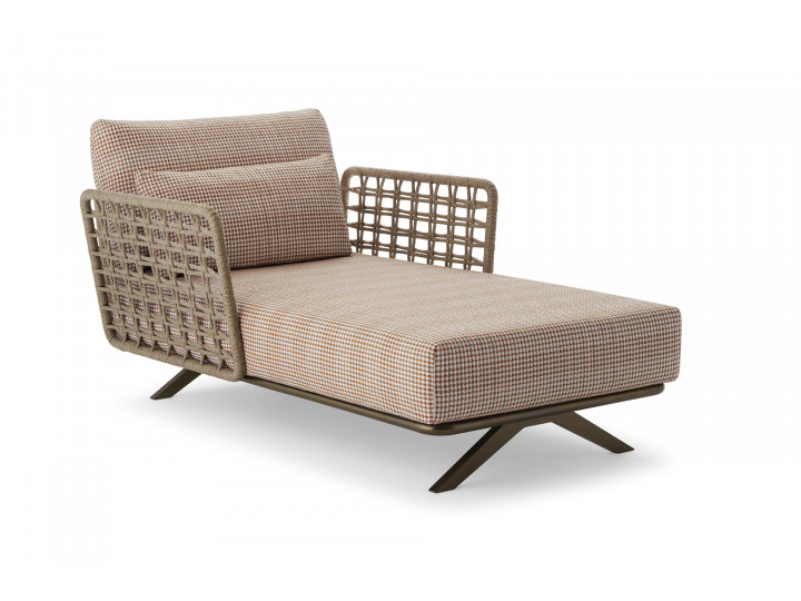 Chaise longue in acciaio inox Aisi 304 ed alluminio, verniciata a polveri ed intrecciata in Oval Trendyrope. Linee che valorizzano l'iconico stile italiano, dove le lavorazioni in corda donano un'estetica materica ed artigianale alla morbidezza avvolgente delle sedute, per concepire uno spazio ideale, dedicato al relax e alla socializzazione. Progettata sia per l'arredamento residenziale che contract, outdoor e indoor.