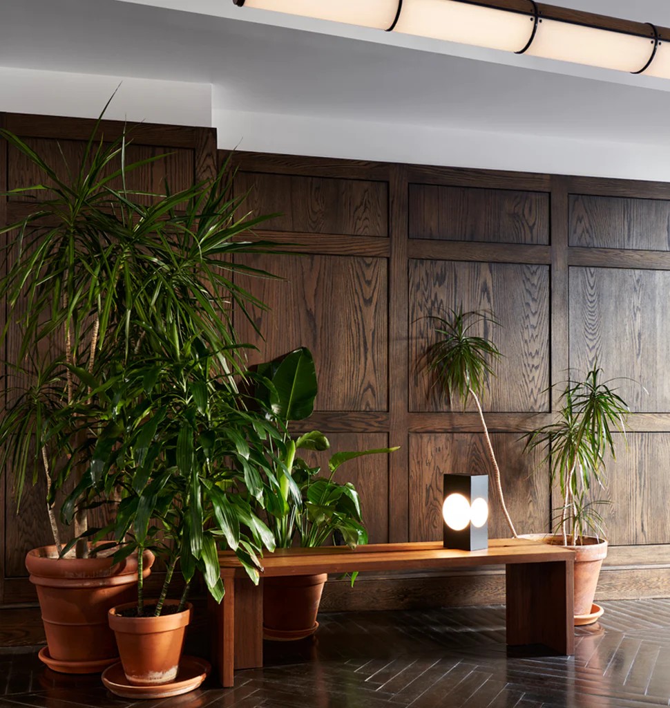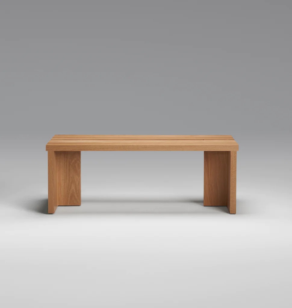 The Grange bench is one of a series of pieces originally designed by Post Company for Inness, a Hudson Valley country resort by tastemaker Taavo Somer that takes all of its cues from the surrounding landscape. The orthogonal passing planes and oversized members of Grange are an ode to a simple method of building, humble and grounded.