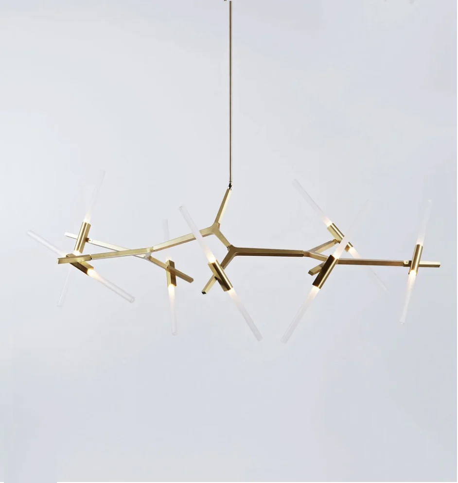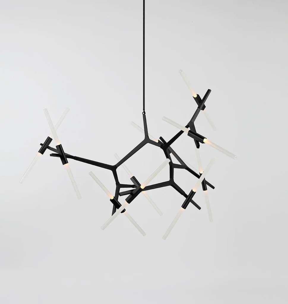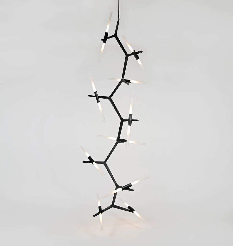 Originally conceived as a candelabra, Agnes takes its inspiration from the fictional heroine of the same name, a worker in the world's oldest profession during the 1849 California Gold Rush. The modular system would allow Agnes easy setup in her makeshift "workspace." In this version, glowing glass tubes replace the candles. Articulated joints allow the glass to be arranged in a multitude of ways.