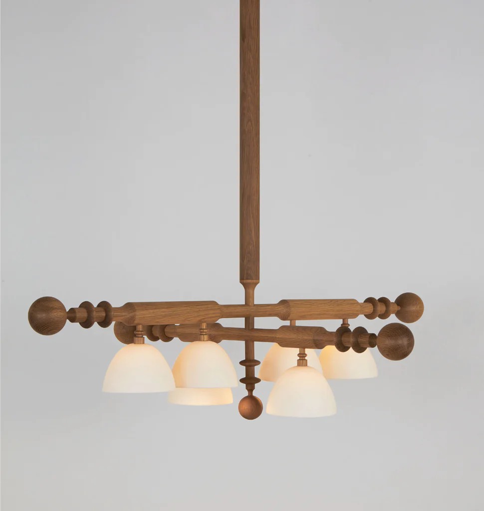 Helgerson's Del Playa is composed of turned wood stems and ceramic shades that recall her childhood on the beaches of Santa Barbara. The materials in this line feel very much of that time and place – the handcrafted aesthetic of California in the 70s.