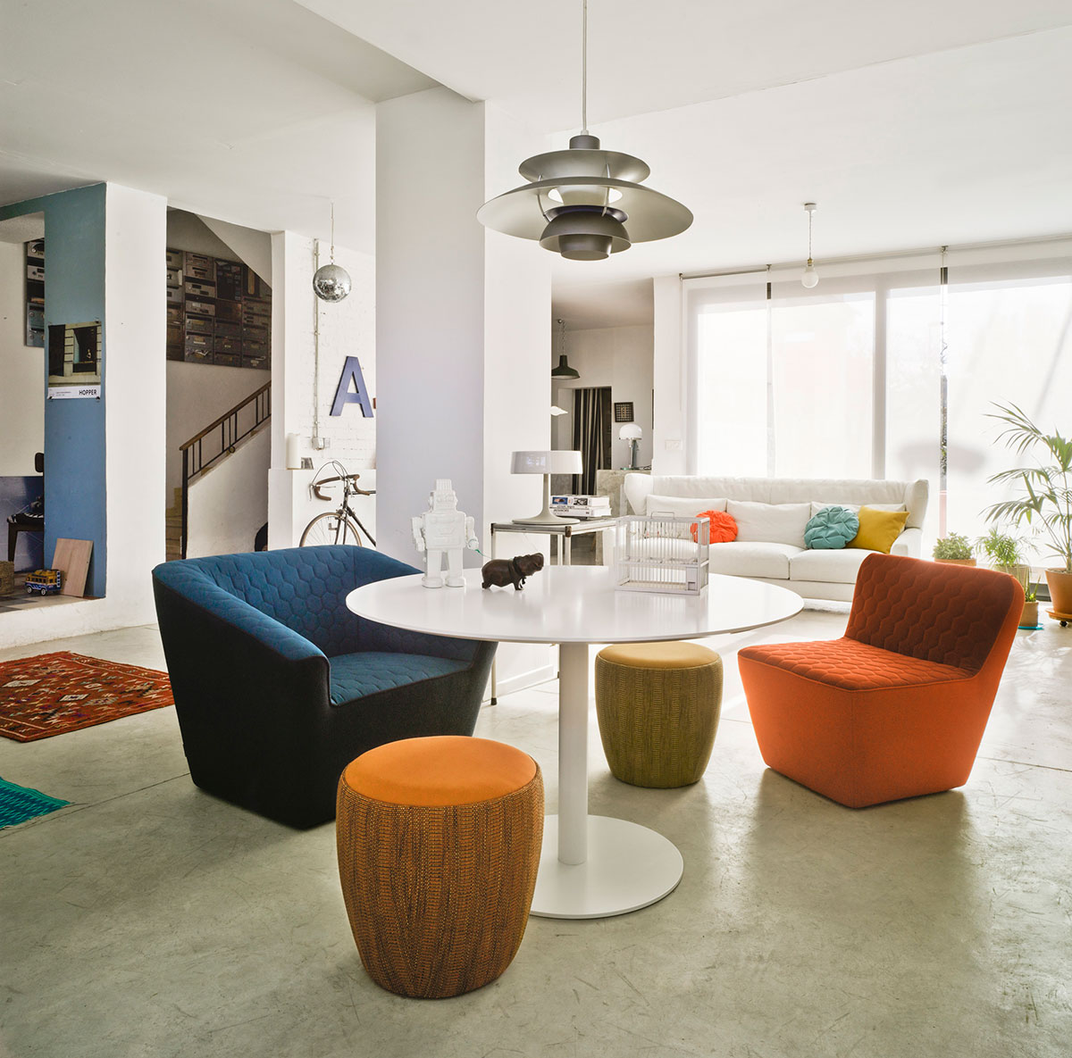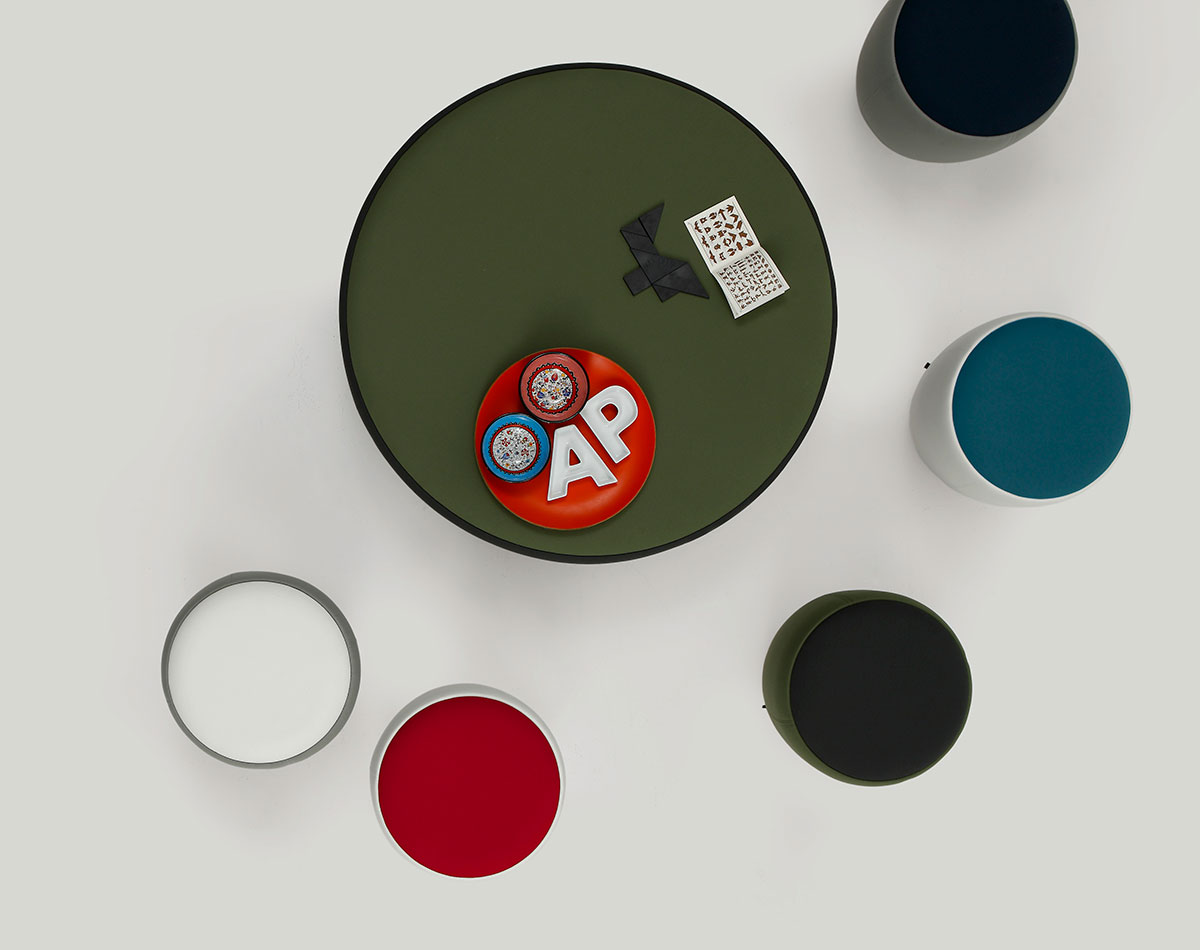 seats formed of one pouf and one stool.
