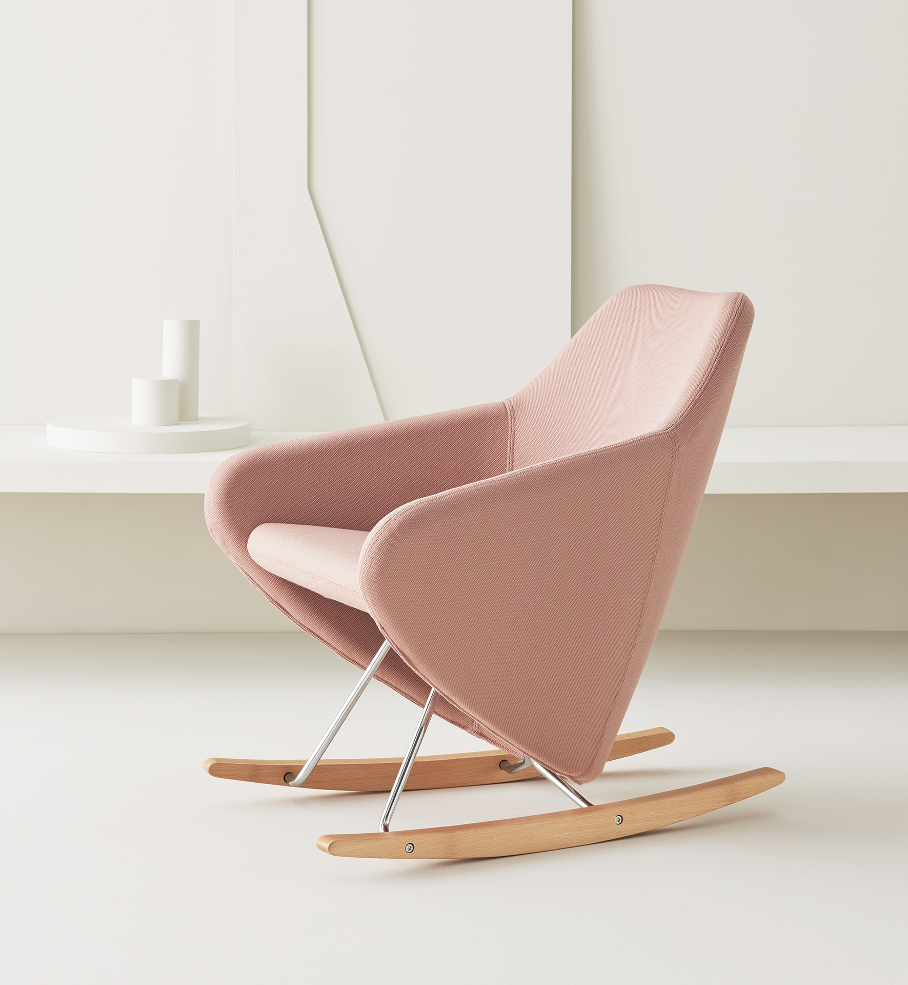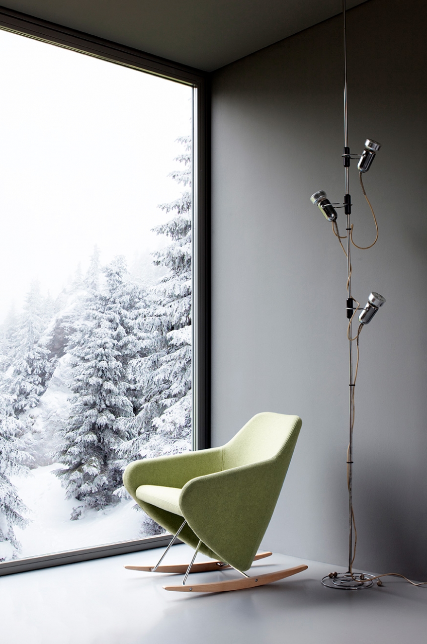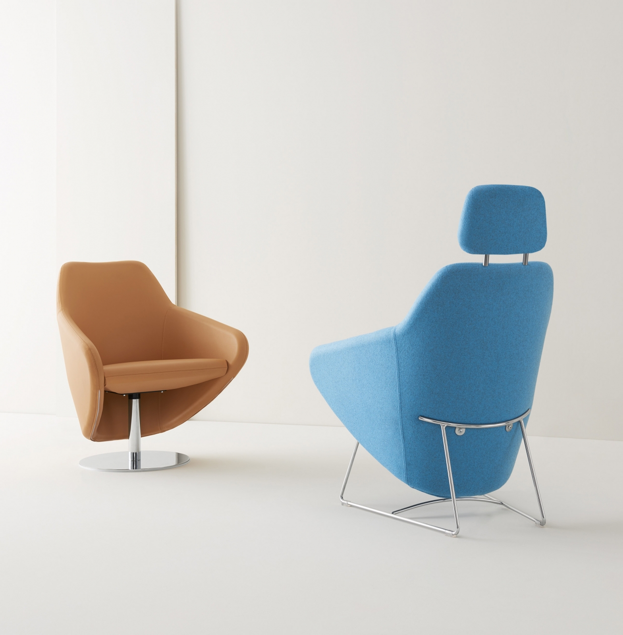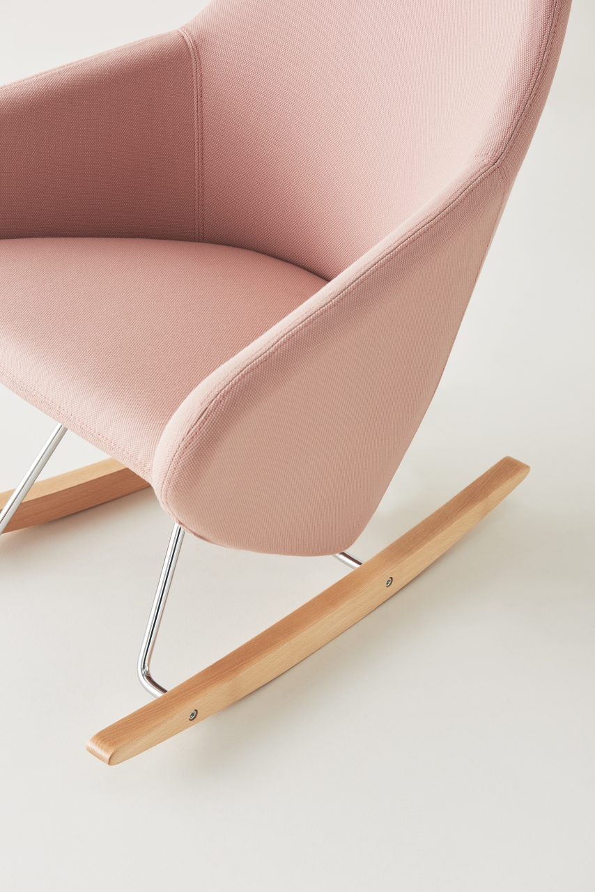 Taxido, a versatile small armchair in a long dress. Choose powder coat or chrome for a firmly grounded steel rod sled base; a rotating steel swivel base; or a swaying chrome rod and solid wood rocking base. In every environment, Taxido’s shaped seat and enveloping backrest design create a comfortable seat, with or without headrest.