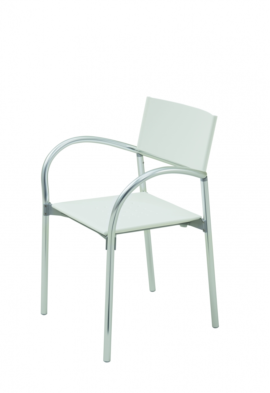 Award winning stacking chair with the simplicity of form and function essential for any environment. Aluminum, anodized or powder coated; seat and back in recyclable polypropylene. The chair and stool are perfect for indoor or outdoor.