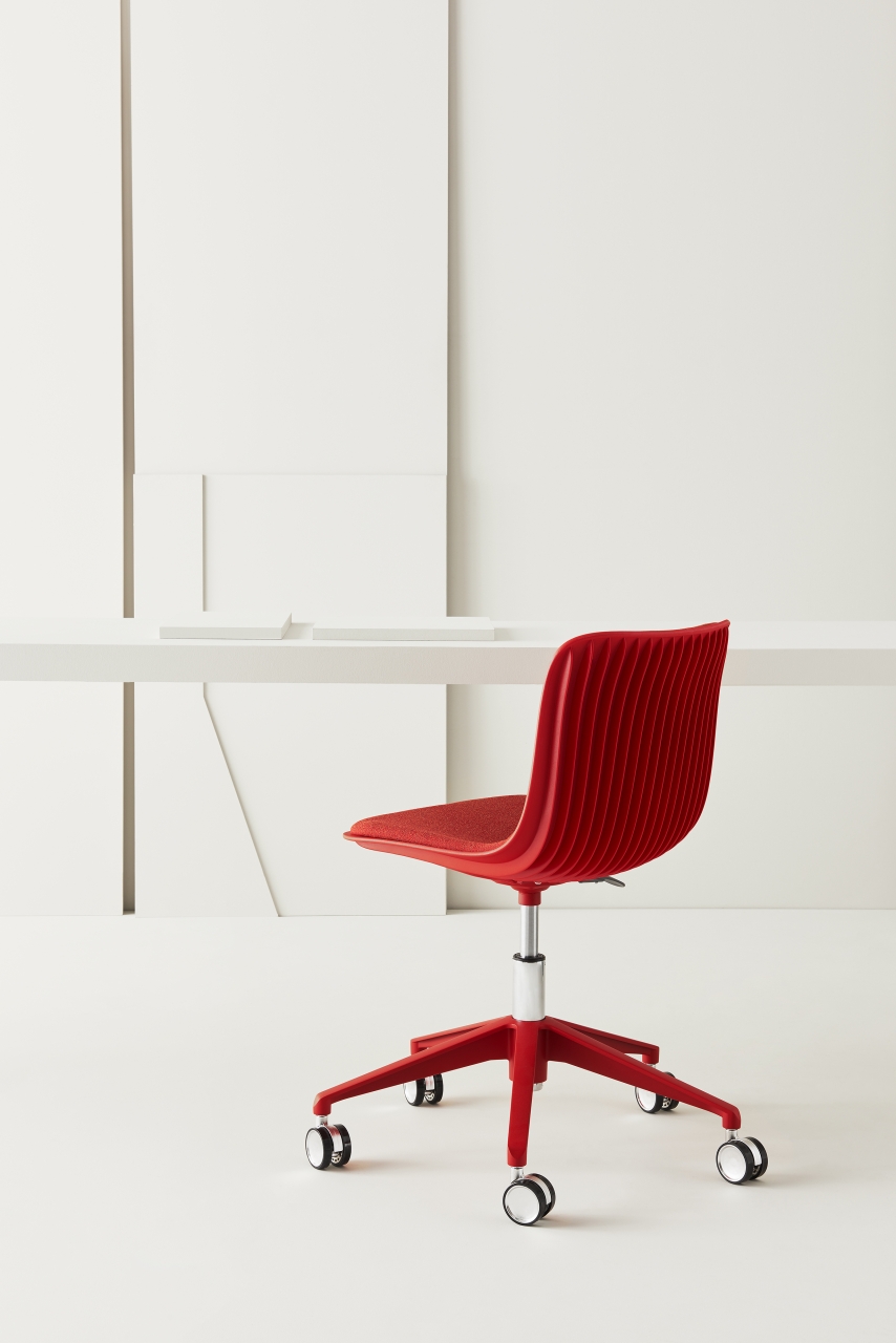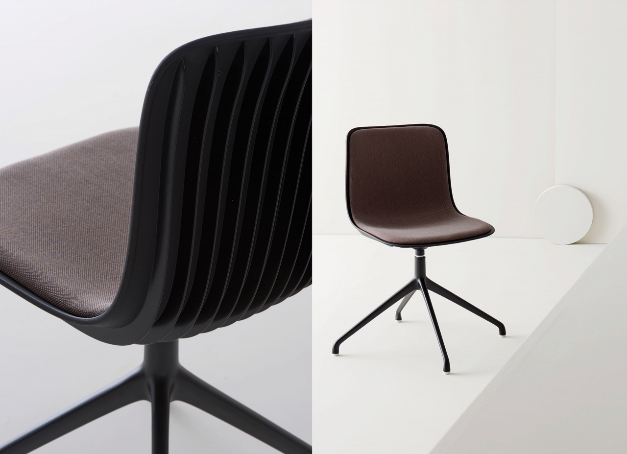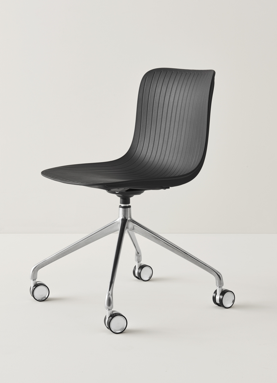 Dragonfly was born from the likes of the body of a dragonfly which is characterized by an imbalance of weight between the legs at the front and cantilevered tail. This observation inspired seating which thus appears to challenge gravity; the shell’s vertical ribbing mimics wings. Multi-functional bases may be paired with a variety of polypropylene shell colours for chairs and stools.
