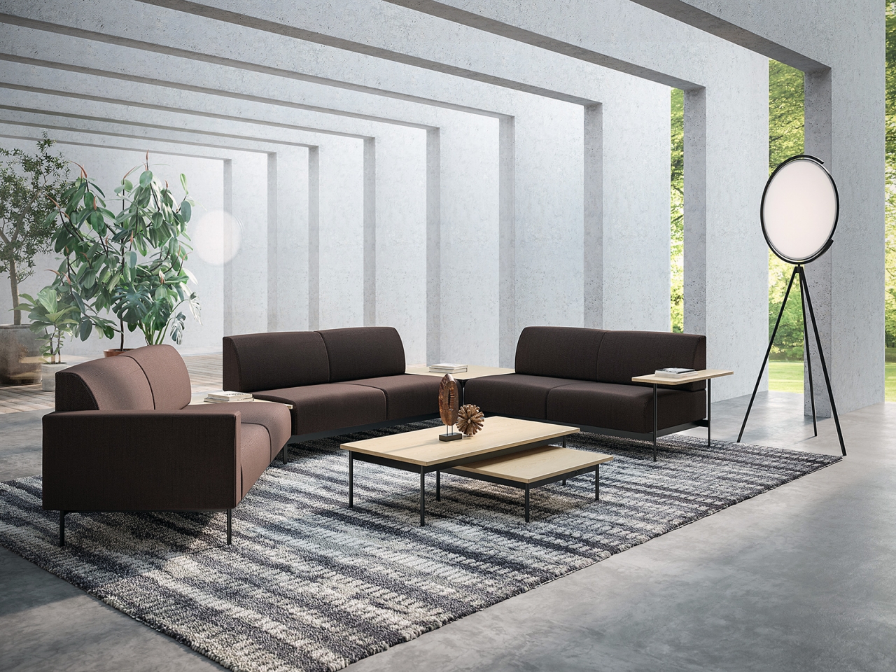 Hotel is a modular seating system characterized by a strong expressive versatility conceived for fluid, linear, and angular combinations. Comfortable pieces designed for enjoyable relaxation and conviviality. The collection includes two and three seater sofas plus an armchair; armrest options include an upholstered armrest in two sizes and a tablet arm for computer or other support. Joining tables between the seats or multifunctional tables complete the collect