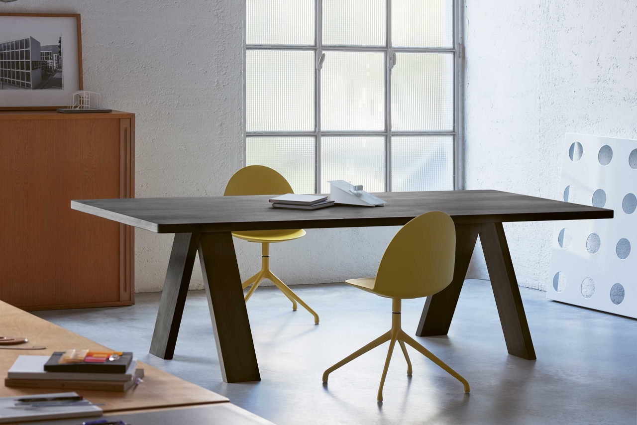The Artful table projects stability though the dimensions of the top’s thickness and whole edge, this is enhanced by the soft line of the edges. Solidity is reaffirmed by the shape of the trestle legs, an element of strength and resistance. Designed for the office environment, the new workstation version features a split and lengthened top offering four comfortable workstations, equipped with wiring accessories. Vertical screens in heat moulded polyester or fabric upholstery ensure privacy and absorb noise thus encouraging concentration and productivity. Natural and black oak veneer finishes are available