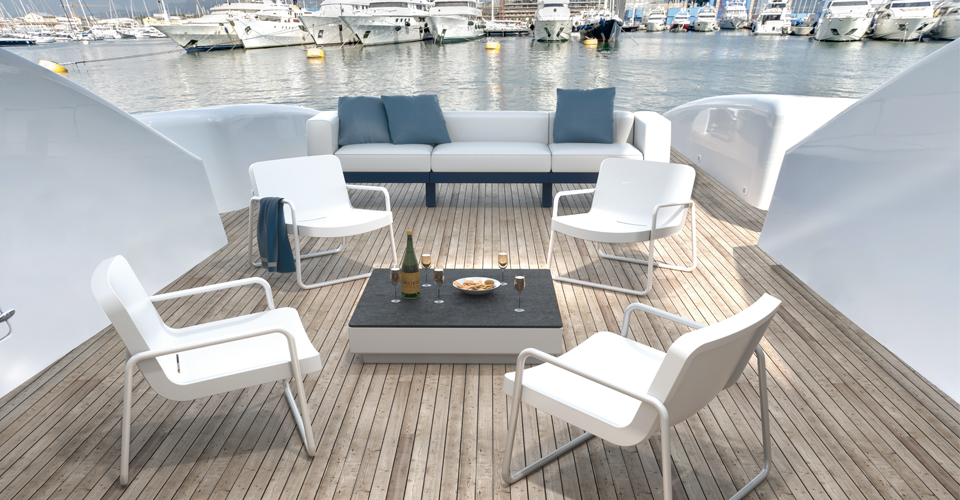 The collection includes: a chair, a small armchair, a stool, a square table, a rectangular table and a chaise longue that is available in both fixed and recliner versions.