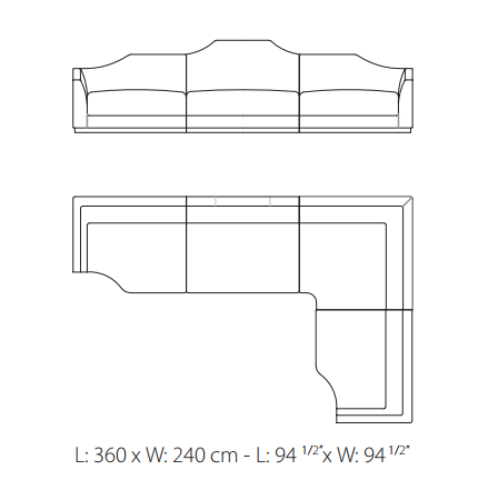 Sofa, frame made of solid timber and plywood. Variable densities polyurethane foam padding. Nr.1 pillow 50x50 cm and nr.1 pillow 50x35 cm in mixed feather. Skirting in antique bronze or antique finish distressed paint.