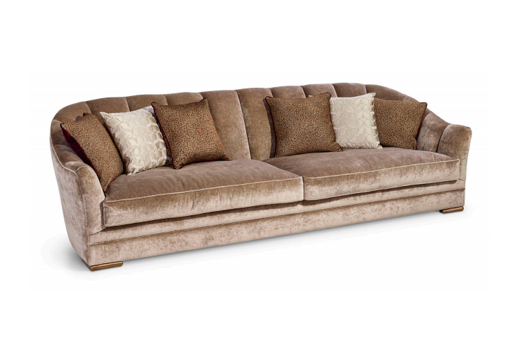 Sofa, frame made of solid timber and plywood. Variable densities polyurethane foam padding. Nr.1 pillow 50x50 cm and nr.1 pillow 50x35 cm in mixed feather. Skirting in antique bronze or antique finish distressed paint.
