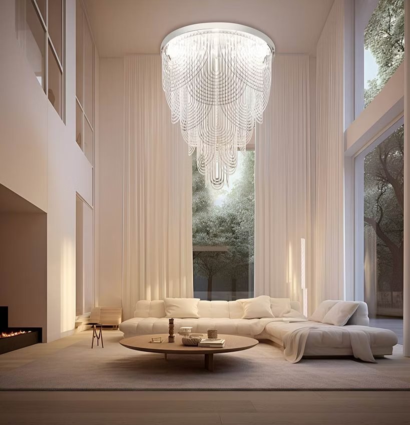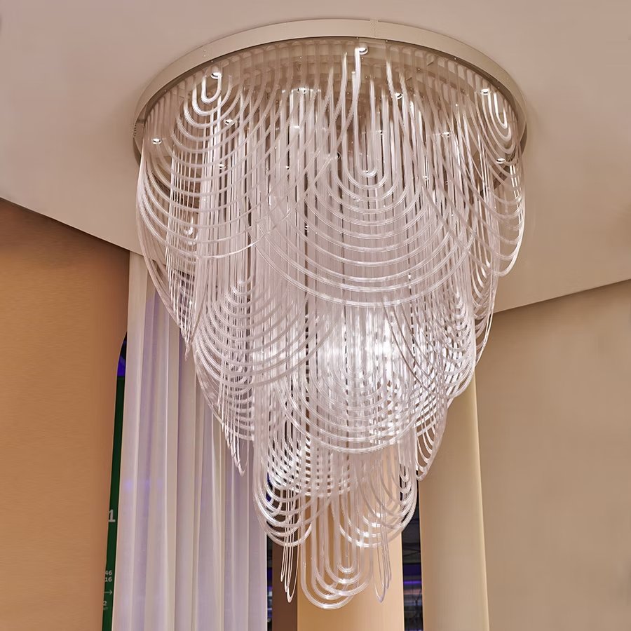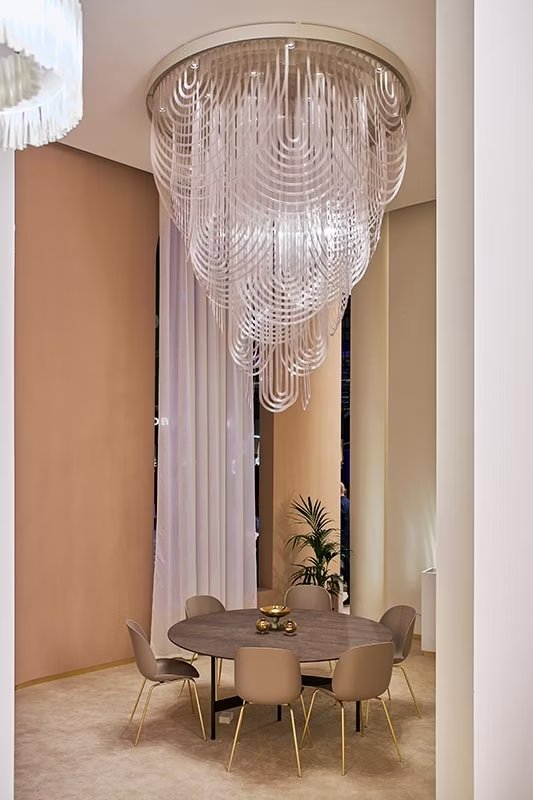 Le Grand Ceremony is a ball gown, a pearl necklace, and the draping of a neckline. Its imposing size contrasts with an intrinsic lightness that makes it easily installable in large-scale projects. 21 spotlights encircle a customizable iron ring (finishing to be determined per project), inserted in the lowered or false ceiling necessary to electrical connection. The light from the light sources spreads among the Cristalflex? 'necklaces,' creating broad and enveloping lighting effects.