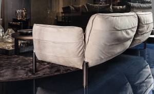 Grandi cuscini che sembrano appoggiati e regalano la sensazione di morbidezza e comfort. Cura del dettaglio: cuciture sul lato esterno, pince nella versione in pelle.