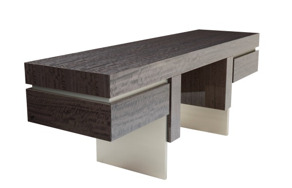 Consolle bi-facciale utilizzabile sia a parete che centro stanza, con cassetti. Presenta un inserto perimetrale in acciaio. Proposta nella nuova essenza di legno Eucalipto Frisè Grigio, ma disponibile anche n Piuma di Noce e Palissandro.