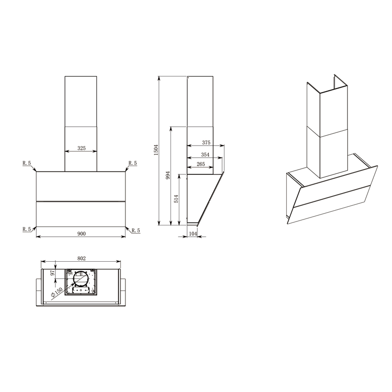 90 cm,中式抽油煙機,壁掛式,拉絲鋼 / 黑色玻璃