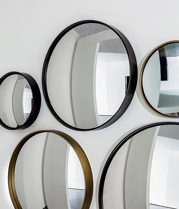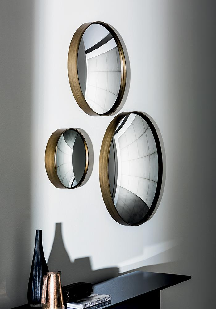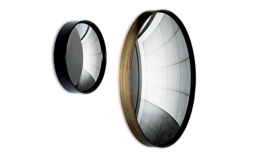 :Specchiera convessa o concava con telaio e cornice in metallo laccato nelle finiture ottone brunito o caffè, disponibile in diverse dimensioni.