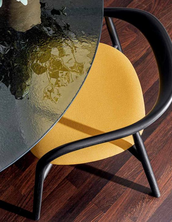 Sedia con struttura in frassino con finitura naturale, tinto nero o noce Canaletto. Sedile in multistrato impiallacciato in noce o imbottito e rivestito in pelle 100% bovina italiana o tessuto di lana Kvadrat.