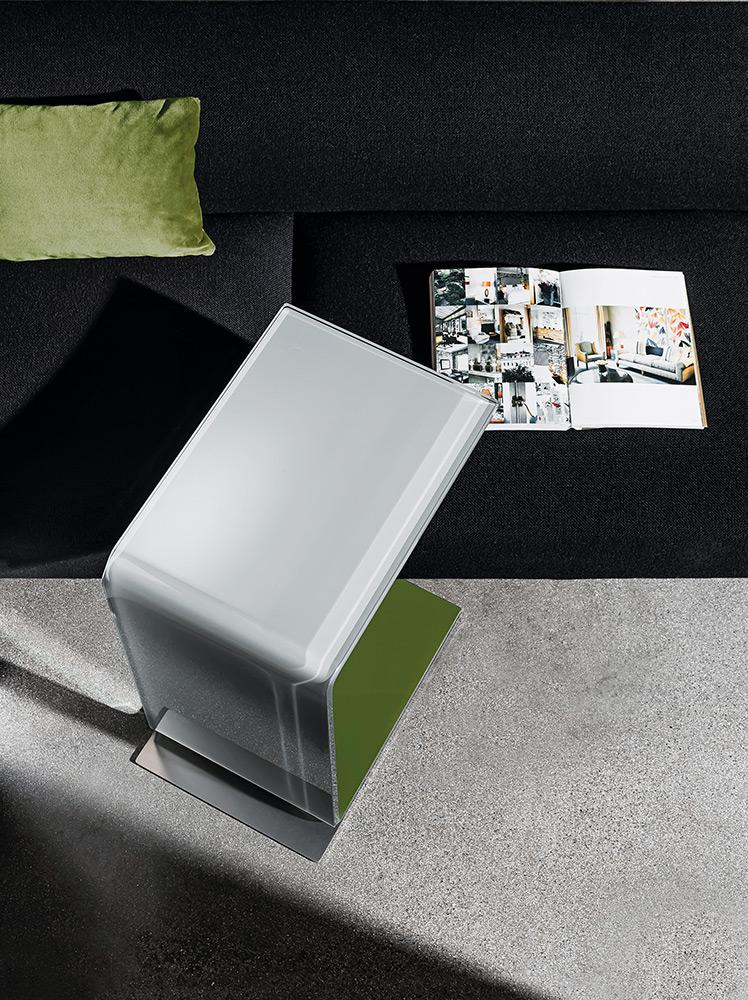 Tavolino in vetro curvo laccato o acidato laccato mono o bicolore. Piastra incollata in inox satinato.
