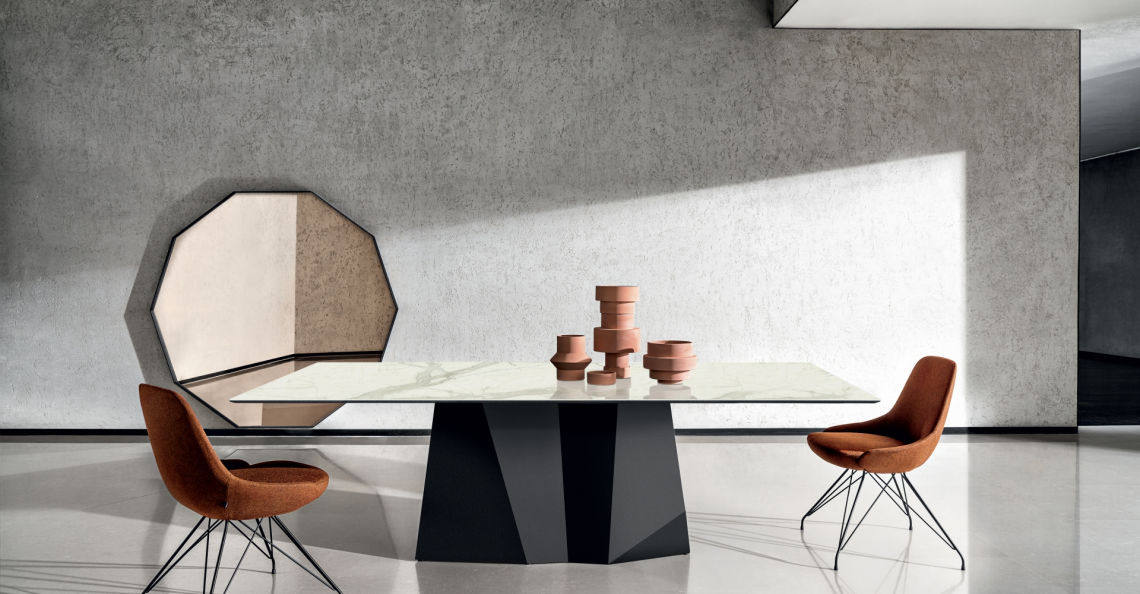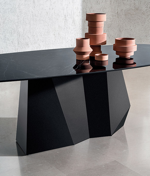 Tavolo con base in metallo verniciato, disponibile in varie finiture. Top temperato o stratificato in varie misure, materiali e finiture
