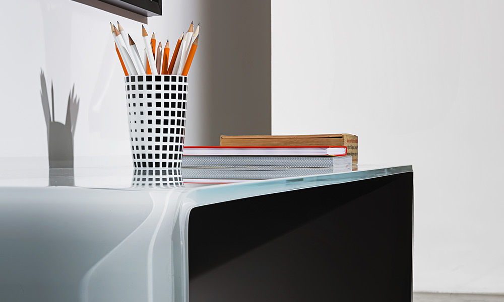 Consolle in vetro curvato trasparente extrachiaro, fumé, laccato, mono o bicolore. Disponibile anche con ripiano in vetro.