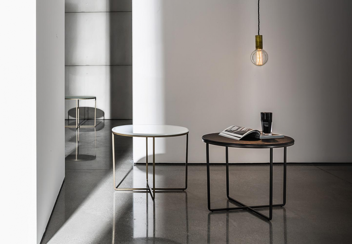 Tavolino rotondo con struttura in metallo laccato nelle finiture ottone brunito o caffé. Top disponibile in vetro laccato o vetro materico specchiato nelle finiture bronzo o perlato.