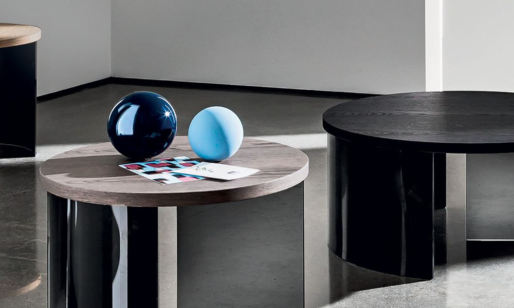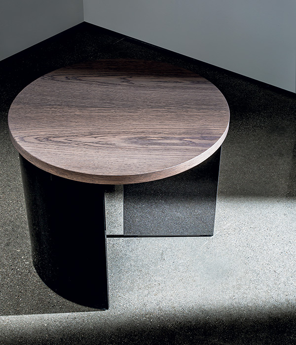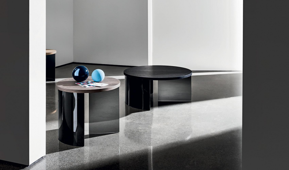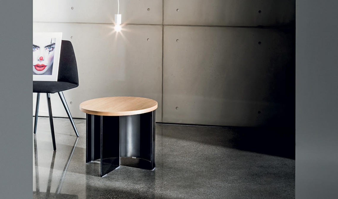 Tavolino rotondo con top in legno impiallacciato rovere, spessore 26 mm, disponibile in varie finiture. La base è composta da un elemento in vetro fumé e da un elemento in vetro curvo laccato nero.