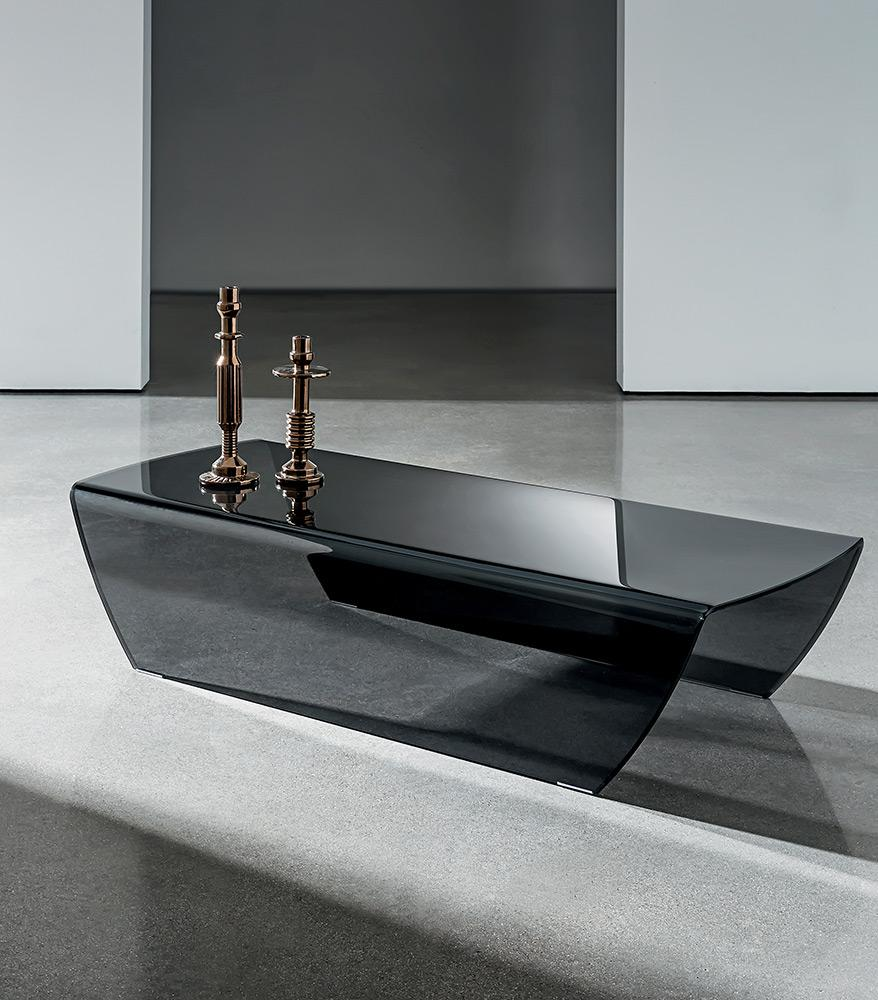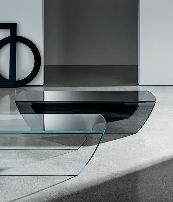 Tavolino in vetro curvo trasparente extrachiaro, fumé o laccato mono o bicolore.