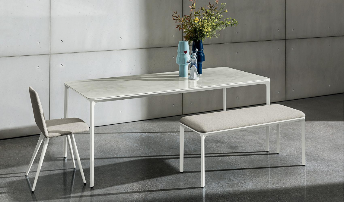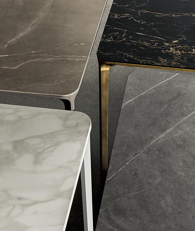 Tavolo allungabile con gambe in alluminio pressofuso cromato lucido o verniciato, varie finiture, e struttura con profilo in alluminio anodizzato, o verniciato, varie finiture. Piano in vetro temperato sp. 8 mm laccato o acidato laccato, in legno, in ceramica o HPL. Nella versione legno l’allunga è sempre in HPL nero.