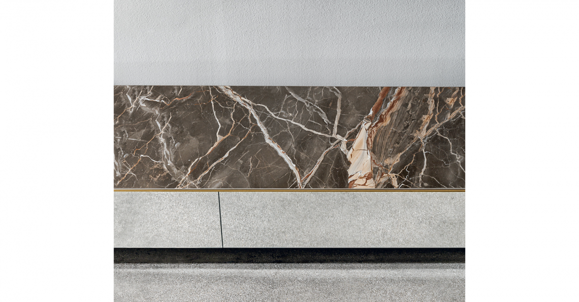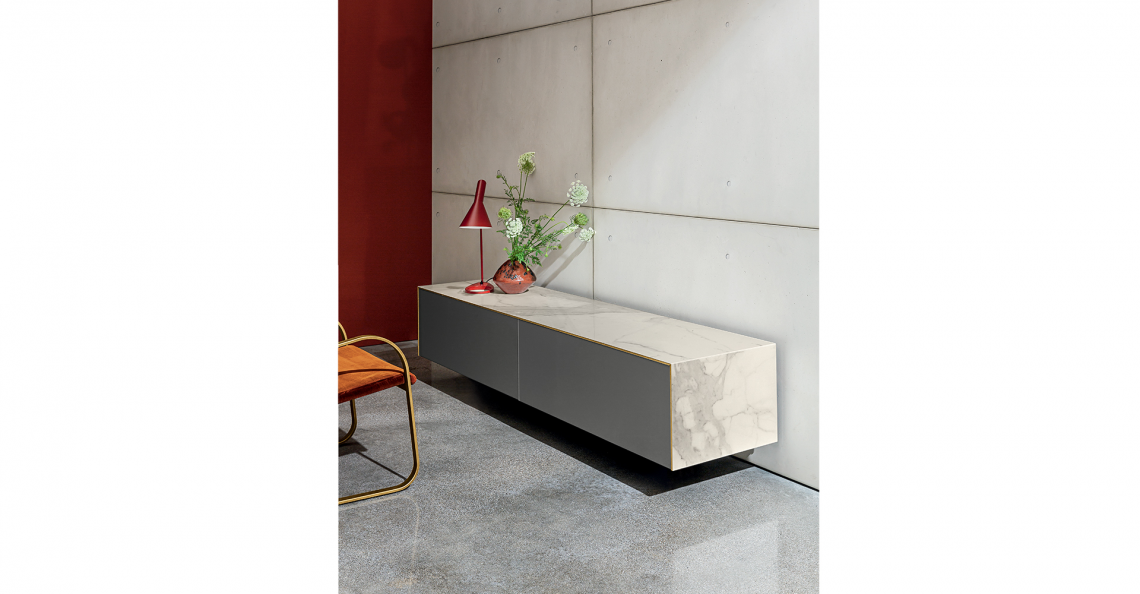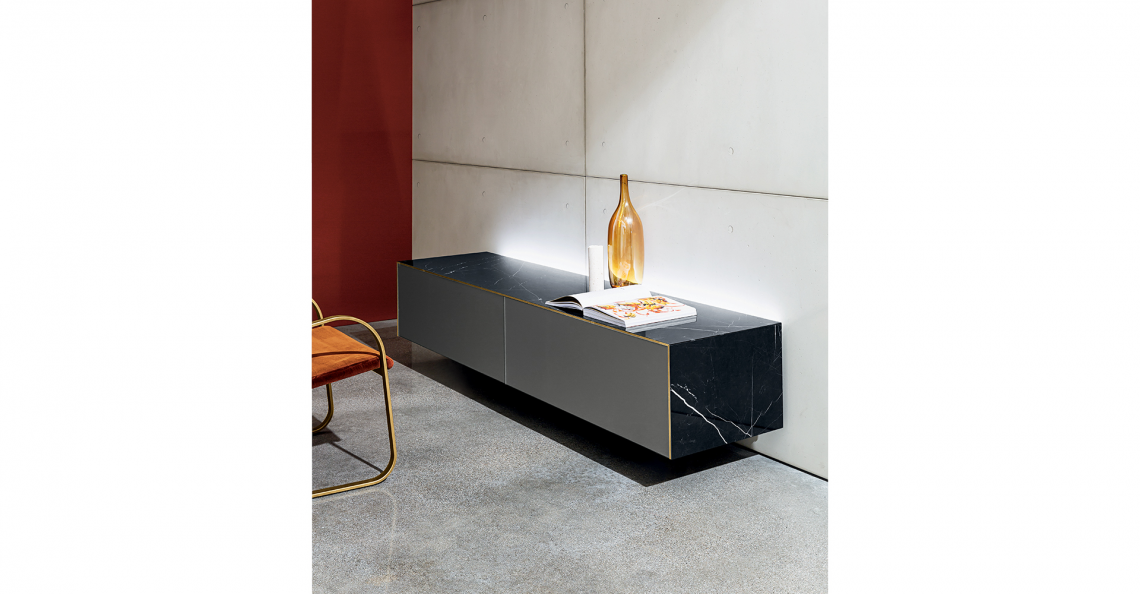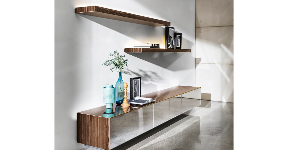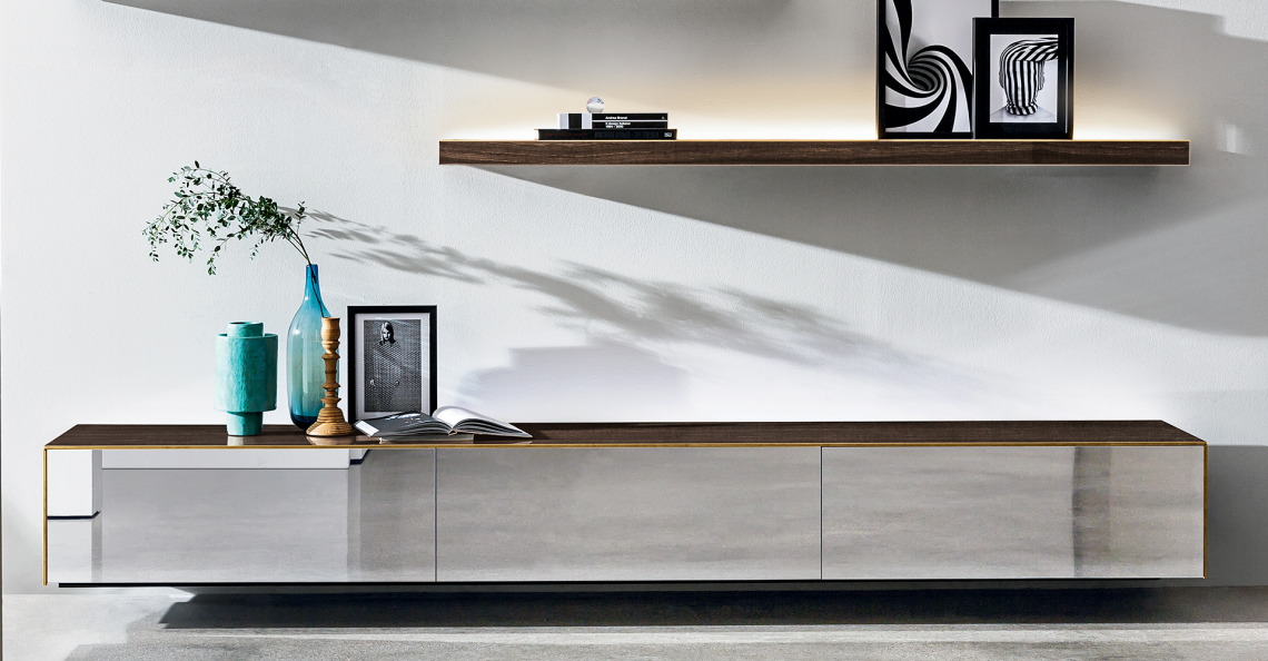Sistema di madie sospese personalizzabili. Struttura e ante disponibili in specchio o ceramica, varie finiture, con o senza profilo in finitura ottone. Disponibile nelle versioni con o senza led. Telaio di sostegno in metallo; eventuali piedini di supporto inclusi.