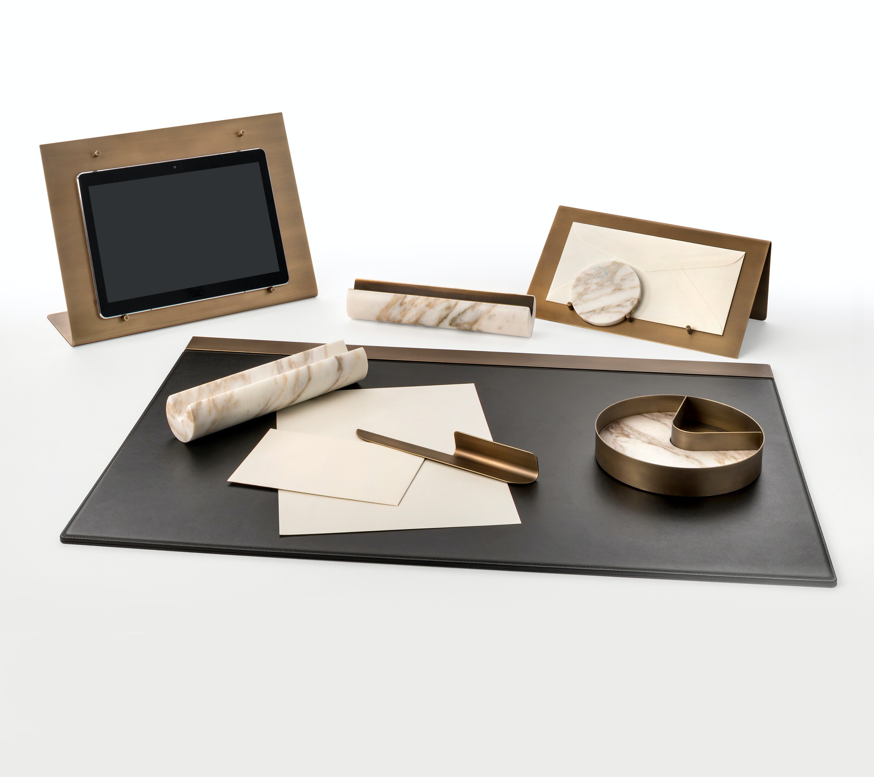 The collection combines burnished brass with Calacatta Vagli, a milky white marble accented with beautiful swathes of pale gold and grey veining.