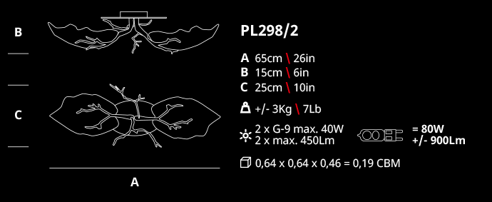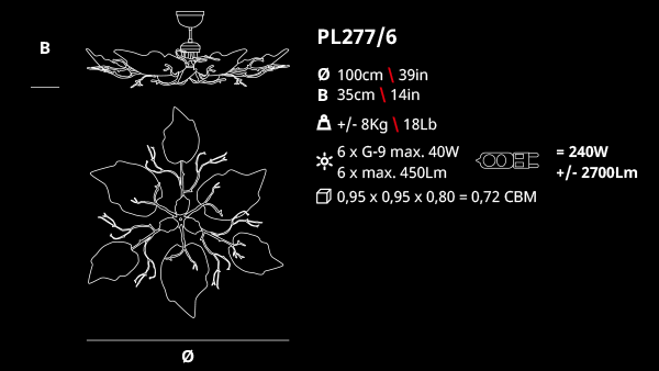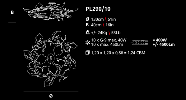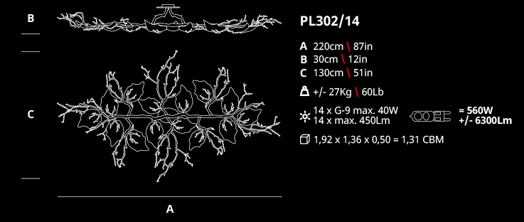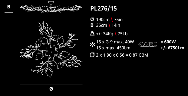 Designed with a random disposition of glass leaves that look like floating lights embraced by branches.