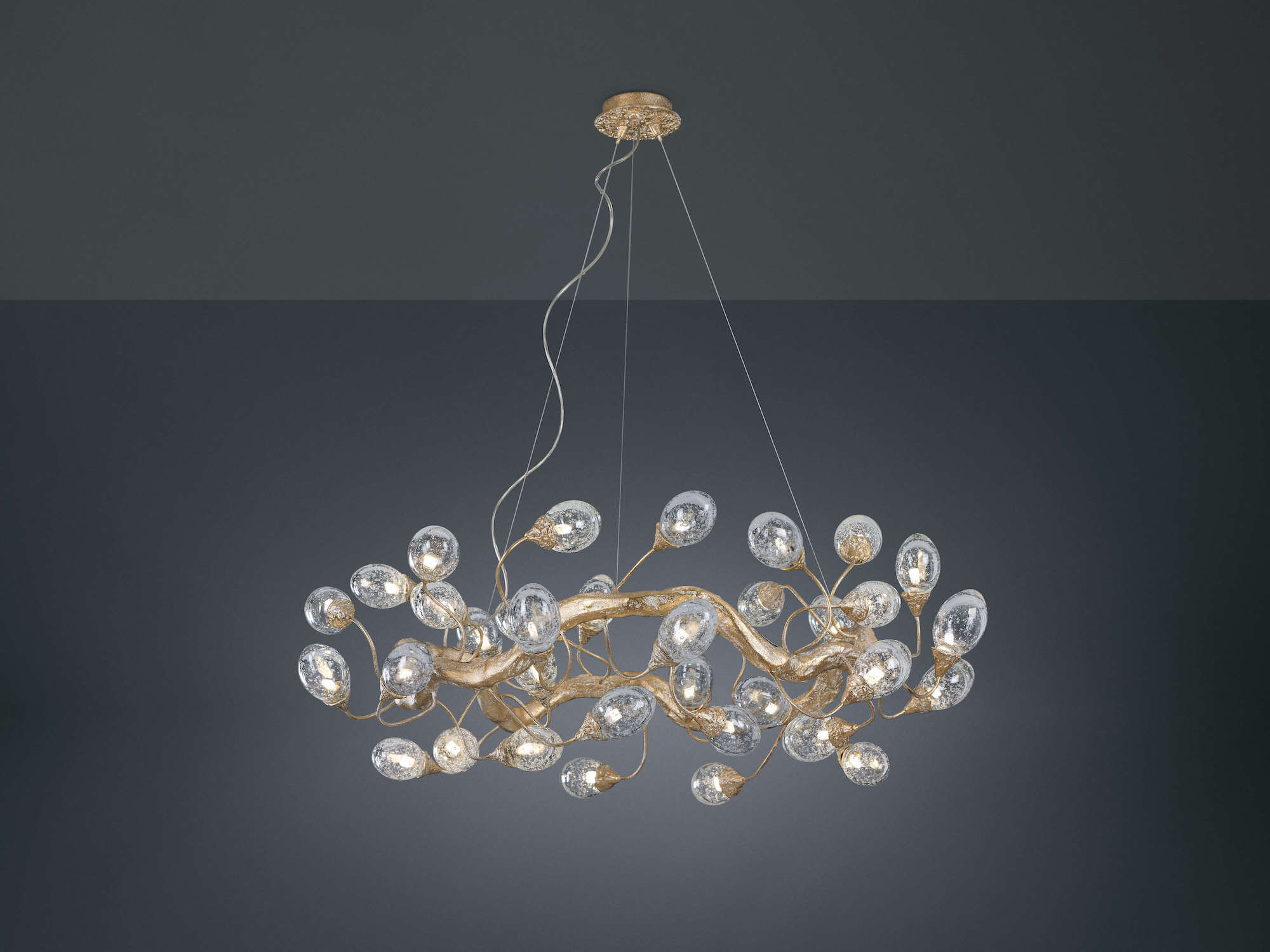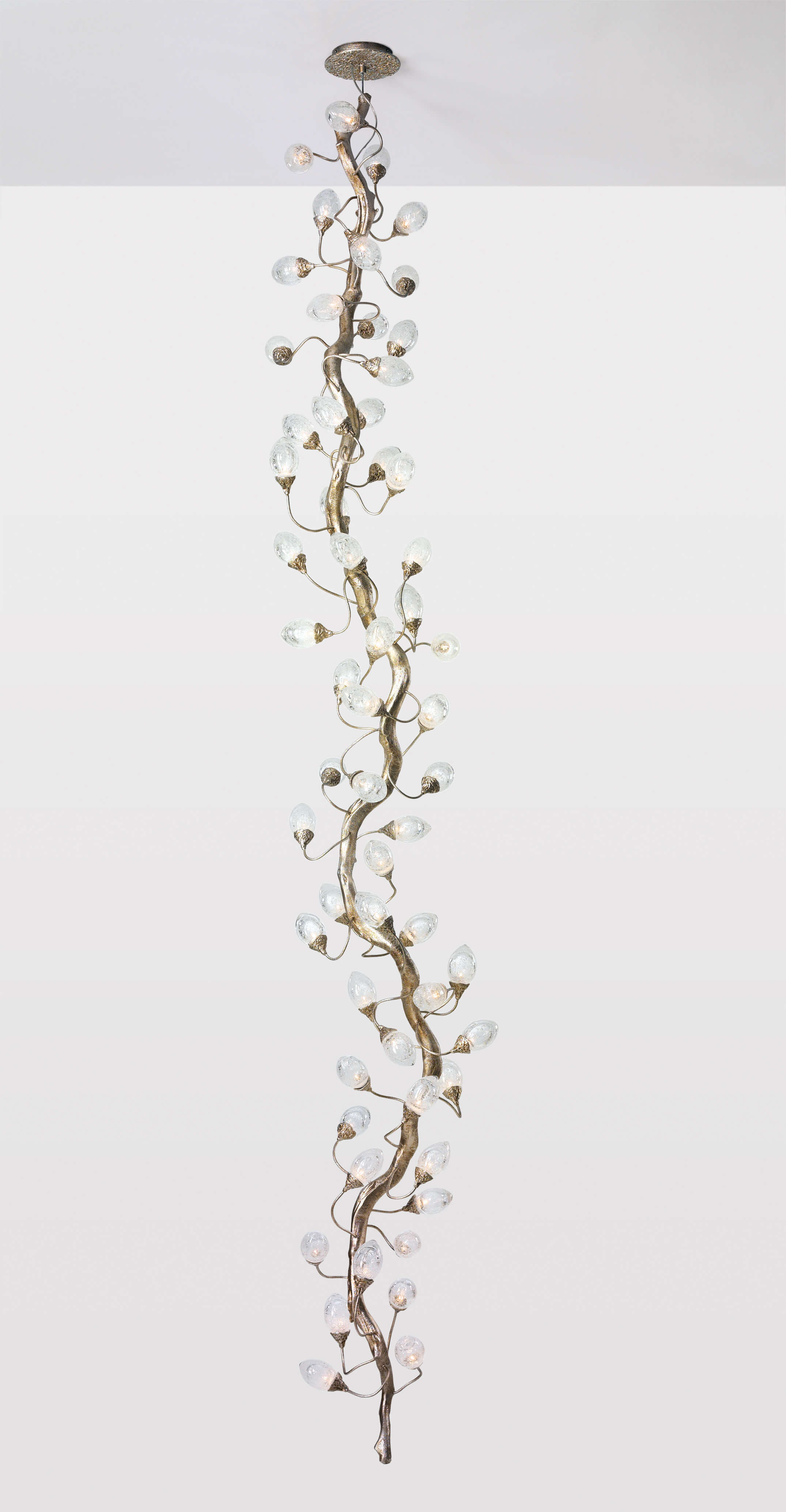 Lotus design follows the inherent evolutionary disposition of an organism, proposing a spiral arrangement almost like a living sculpture of motion and growing light sources. The egg-shaped glass pieces emit light to involve the entire piece as a single organic silhouette, a Serip trademark throughout all lighting designs, revealing an interesting glass work that includes bubbles in each piece - factor that confers unique characteristics to the light emission.