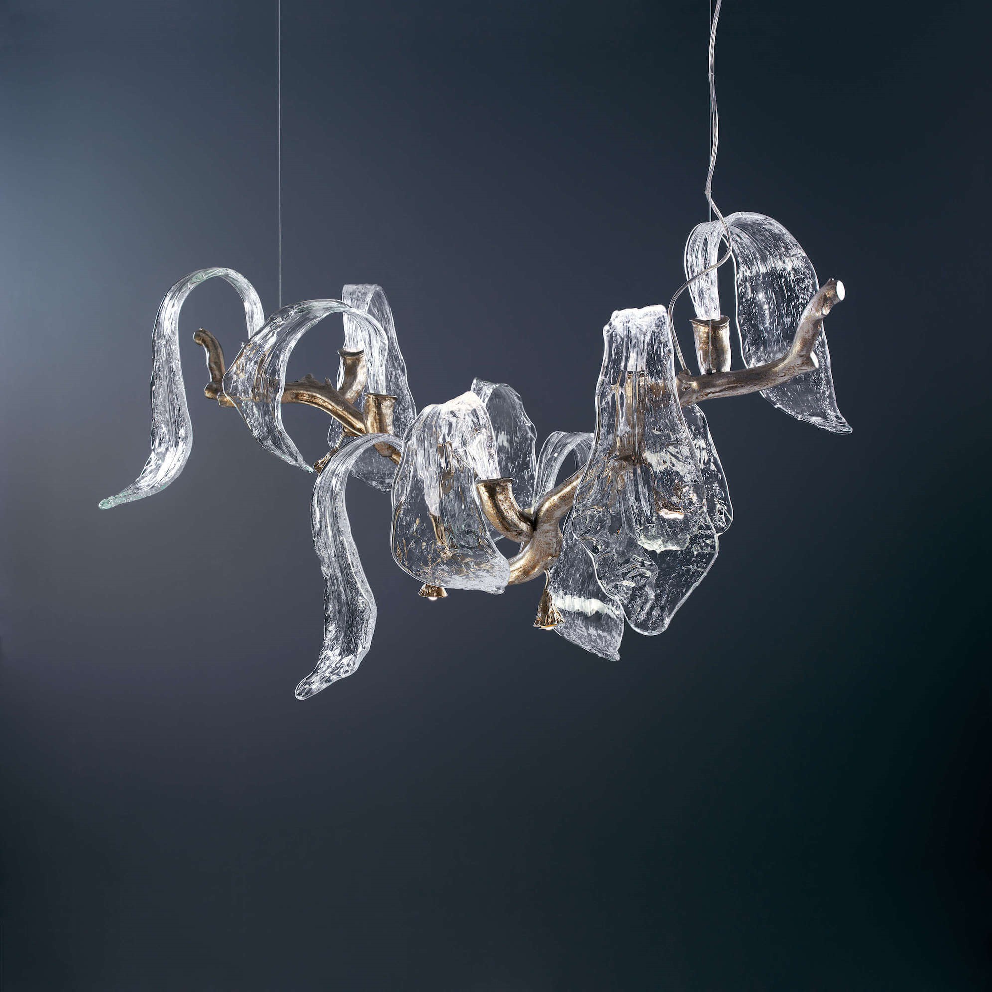 With a particular design, the Icarus collection looks as if a frozen fountain was taken directly from its natural setting. Designed like a sculpture by its close resemblance to its nature, the light emerges within the crafted glass, following the liquid motion that grows supported by the bronze central branch.