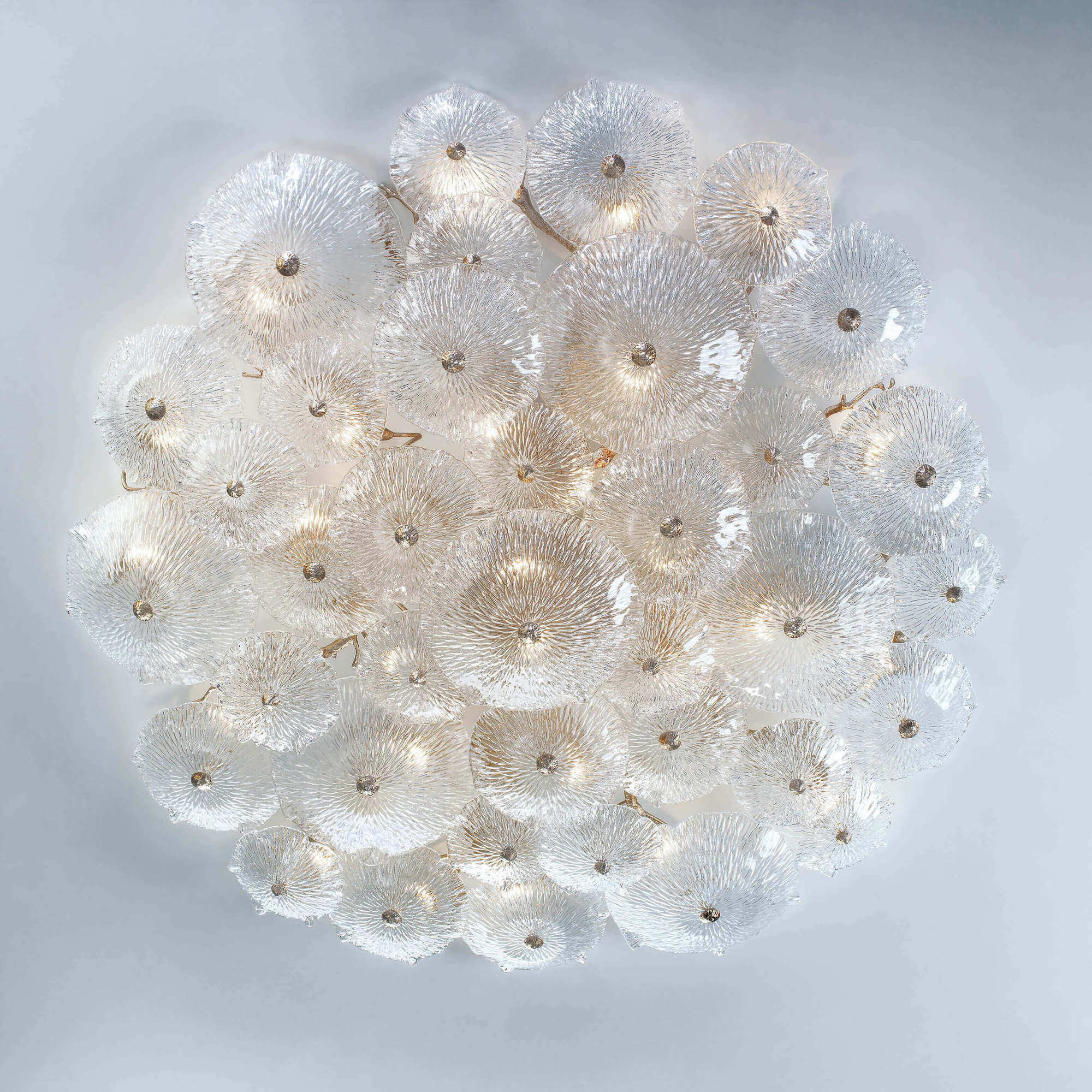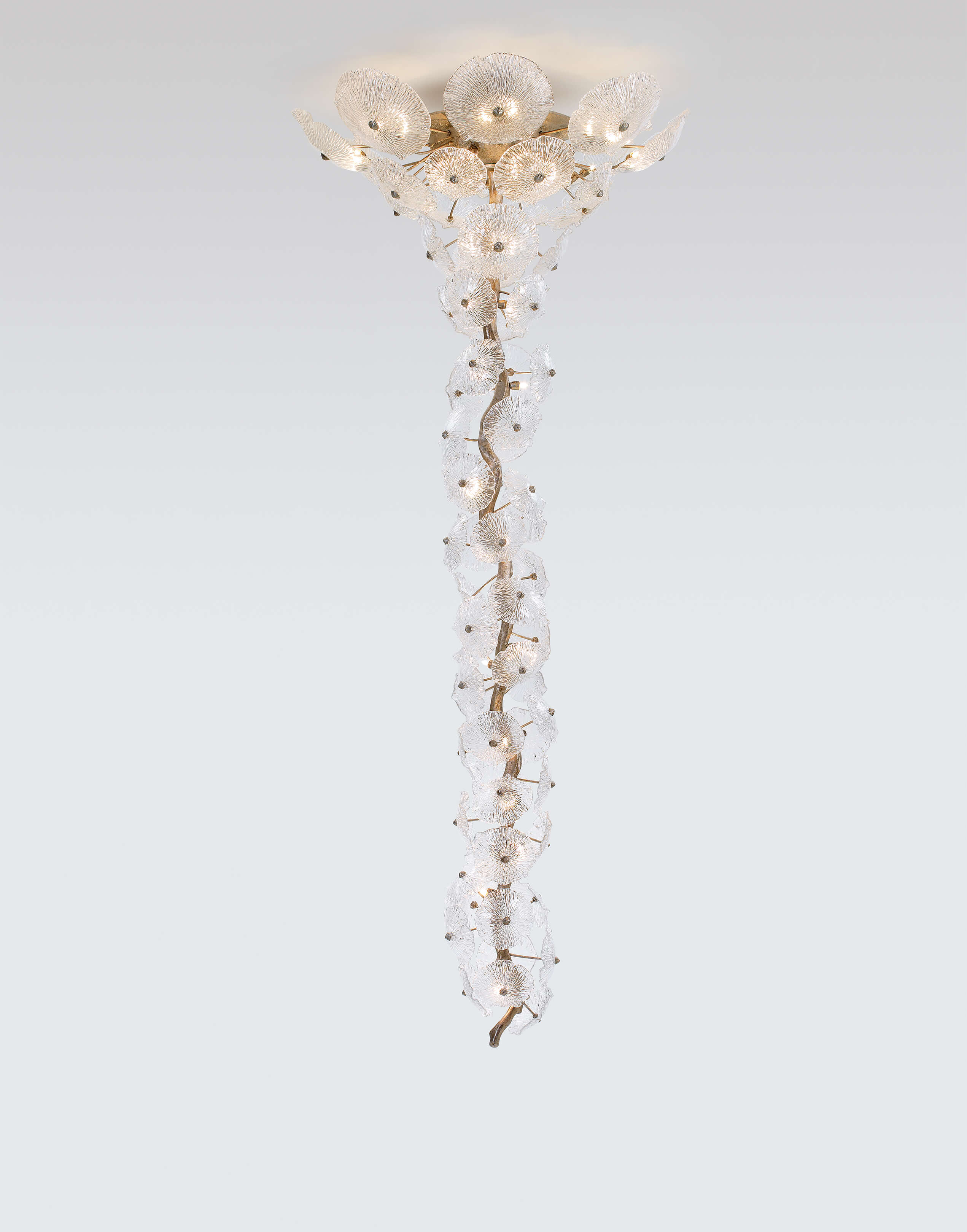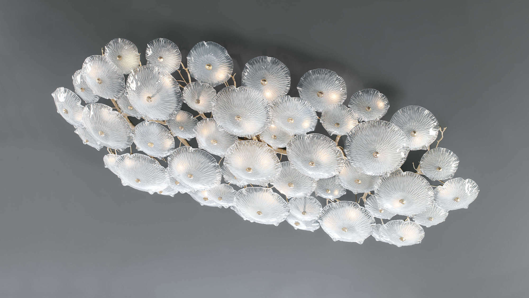 Beyond its particular dense structure and closed shape in some designs, it seeks an uncanny levitating sense, allowing multiple perspectives through the carefully crafted Murano glass pieces. Through the glass specifications, the Nenufar achieves diffuse lighting providing an alluring romantic sense, reminiscent of the natural beauty of nature.