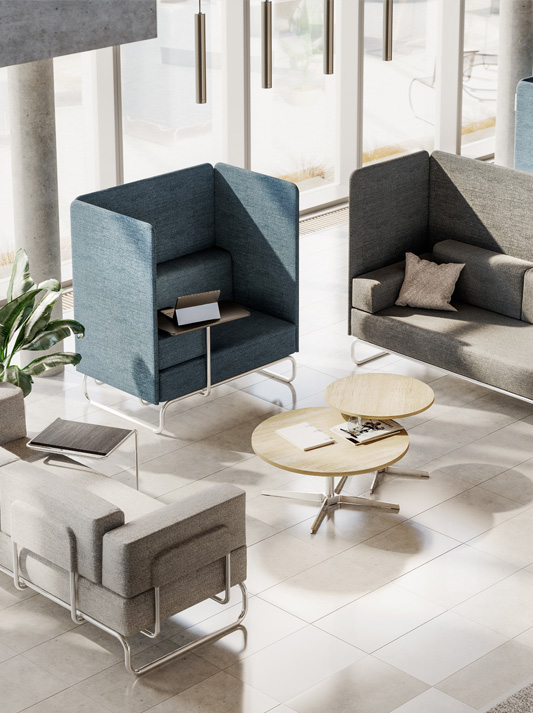 Based on the archetype of the minimalist sofa with a base of bent tubular steel, which was first added to the Thonet portfolio in the 1930s, designer James Irvine developed a versatile furniture system that can be used in a variety of settings. The S 5000 sofa range is based on a simple, intelligent construction idea that makes use of the modular principle. Inspired by the ever-increasing fusion of working and living spaces, Studio Irvine, in keeping with its founder, took on the task of intelligently refining it, so that it would fit into the modern concept of New Work: structurally identical arm and backrests or dividing panels can be integrated into the seat frame as needed to serve as a sight and noise barrier. This makes it expandable in a variety of ways, and, thanks to its variable side panels, it can also be used in multi-space offices. The panels create a frame for various cushions, which can be loosely put in the desired place. The furniture range also includes small tables that are screwed to the tubular steel frame.