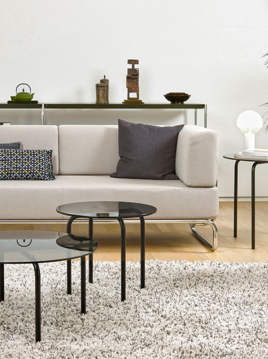 Based on the archetype of the minimalist sofa with a base of bent tubular steel, which was first added to the Thonet portfolio in the 1930s, designer James Irvine developed a versatile furniture system that can be used in a variety of settings. The S 5000 sofa range is based on a simple, intelligent construction idea that makes use of the modular principle. Inspired by the ever-increasing fusion of working and living spaces, Studio Irvine, in keeping with its founder, took on the task of intelligently refining it, so that it would fit into the modern concept of New Work: structurally identical arm and backrests or dividing panels can be integrated into the seat frame as needed to serve as a sight and noise barrier. This makes it expandable in a variety of ways, and, thanks to its variable side panels, it can also be used in multi-space offices. The panels create a frame for various cushions, which can be loosely put in the desired place. The furniture range also includes small tables that are screwed to the tubular steel frame.