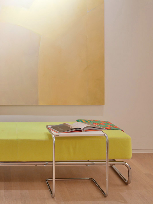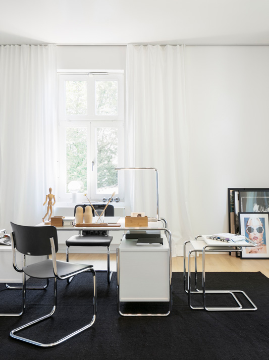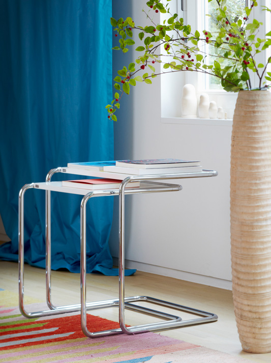 Elegant, flexible and suitable for a variety of uses. In its dimensions, the table set B 97 is reminiscent of Marcel Breuer’s nesting table B 9. Its altered construction, however, offers a practical advantage: due to the opening on one side, the tables can be pulled over the edge of a sofa, armchair or bed. They can also be conveniently pushed into one another. The Thonet design from 1933 is among the classics of tubular steel furniture.