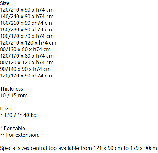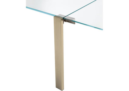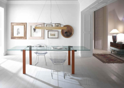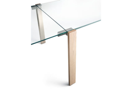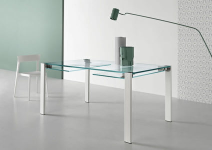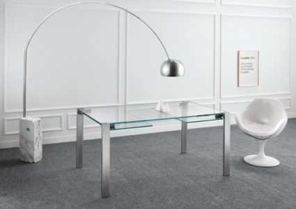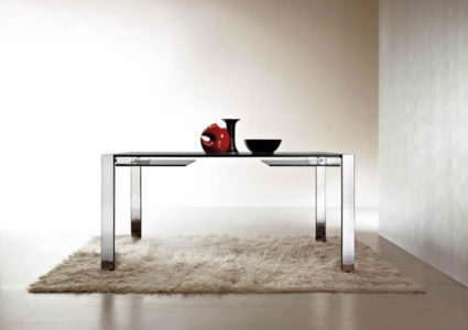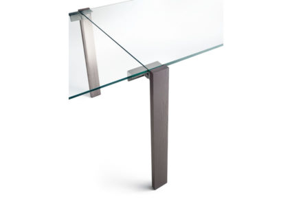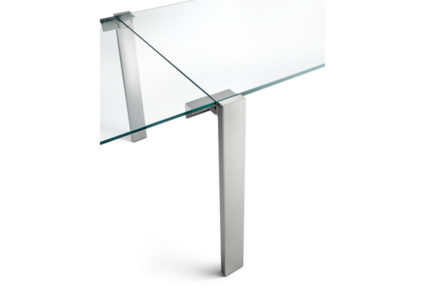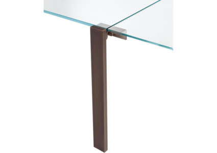 Top in transparent, or extraclear glass. Legs available in chrome, black or white lacquered, covered with leather, or wood, brushed copper, brushed gold, brushed bronze or gunmetal.